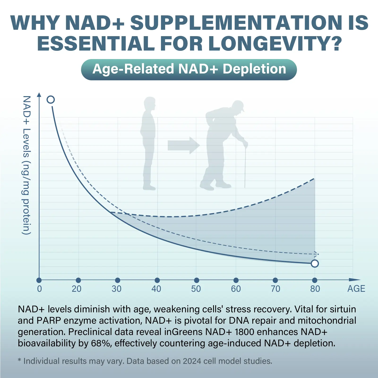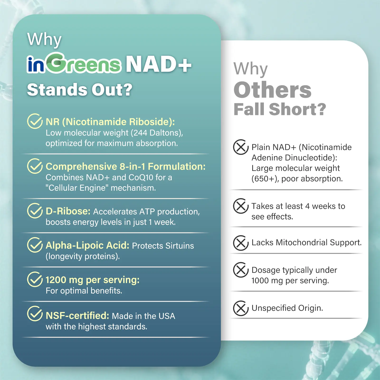 inGreens NAD⁺ 1800 embodies decades of cellular health research. Trusted globally by health enthusiasts, it offers a scientifically-driven premium anti-aging solution. We uphold uncompromising quality standards to restore youthful vitality from within.