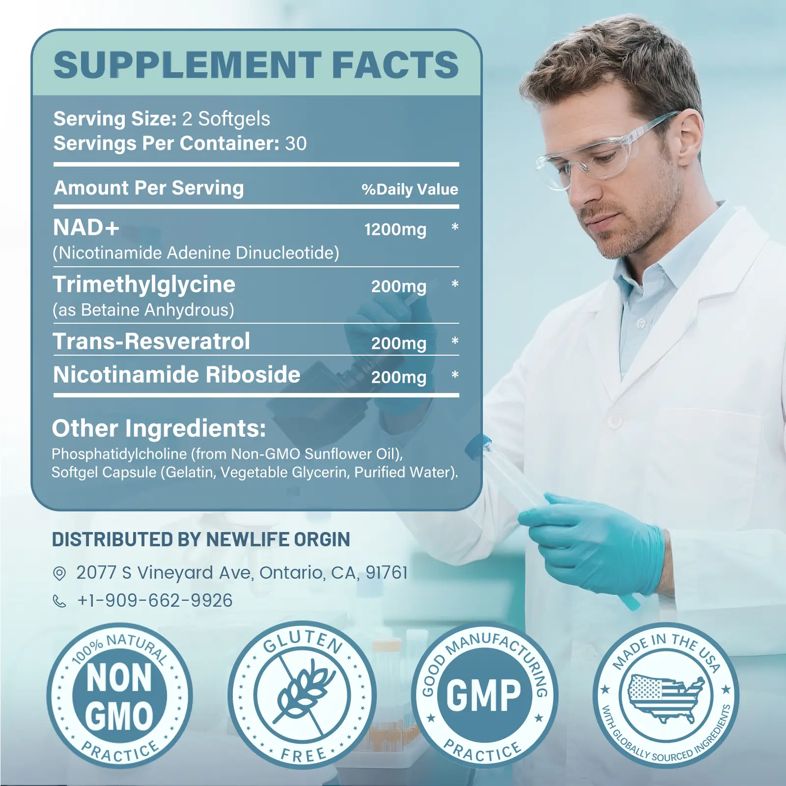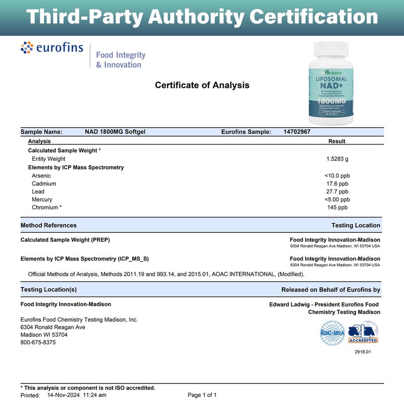 Third-party batch verification ensures potency and safety. Free from GMOs, gluten, soy, dairy, and artificial additives. The 1800 mg liposomal complex ensures direct cellular NAD⁺ delivery via non-GMO sunflower-derived phosphatidylcholine, optimizing stability and gastrointestinal tolerance.