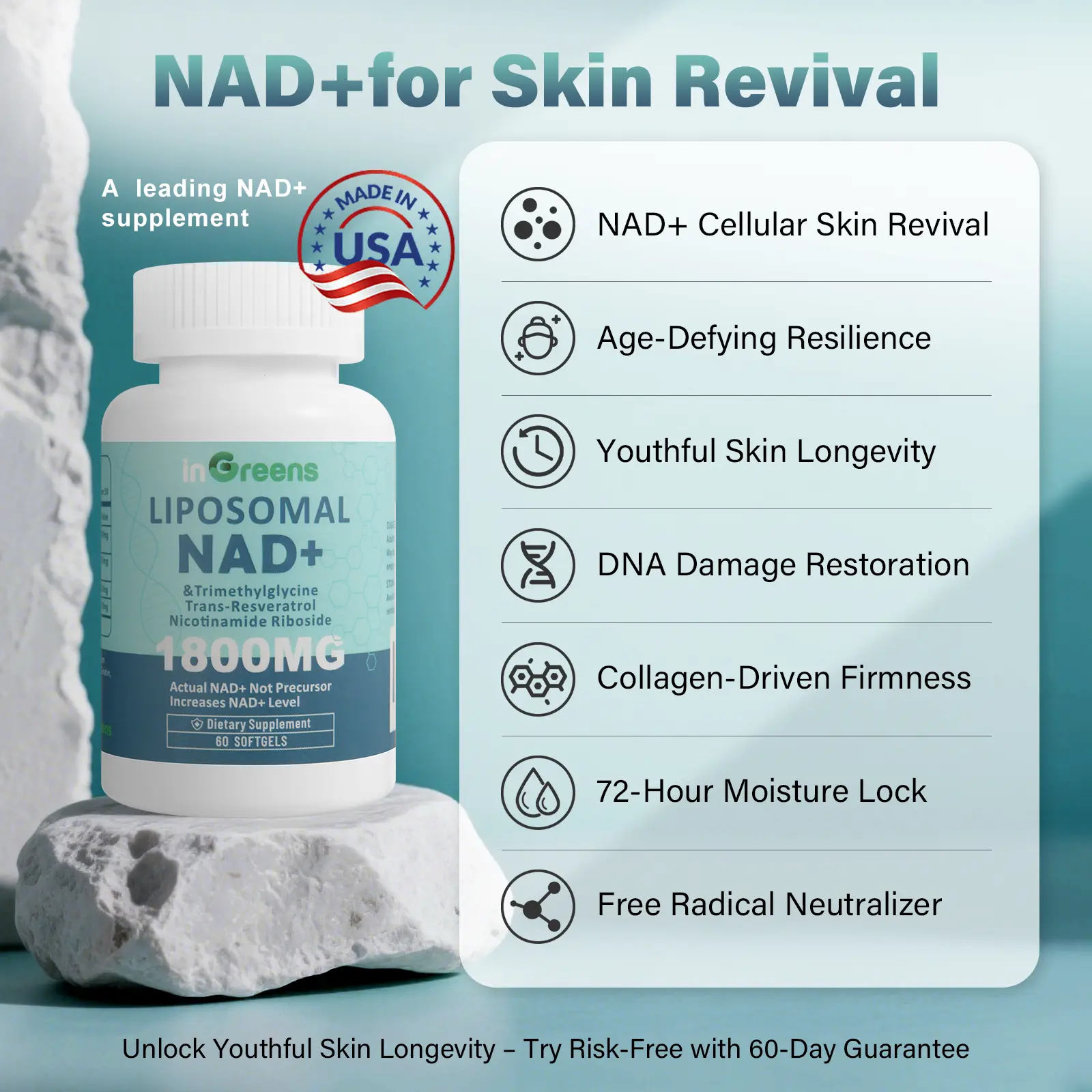 inGreens NAD⁺ 1800 delivers 1200 mg of liposomal NAD⁺, 200 mg trimethylglycine, 200 mg trans-resveratrol, and 200 mg nicotinamide riboside. It replenishes intracellular NAD⁺, activates SIRT1, and targets oxidative stress. This advanced formula promotes anti-aging benefits for skin, hair, and nails while enhancing systemic vitality.