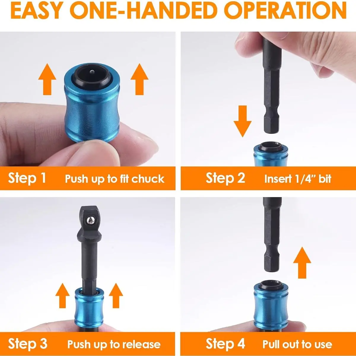 ·Quick Connect & Easy to Use: The drill socket adapter features a pull-out design and is designed with ball bearings to hold the drill bit in place, allowing for quick replacement with just one hand. This drill bit holder is suitable for transferring various drill bits, screwdrivers, etc.