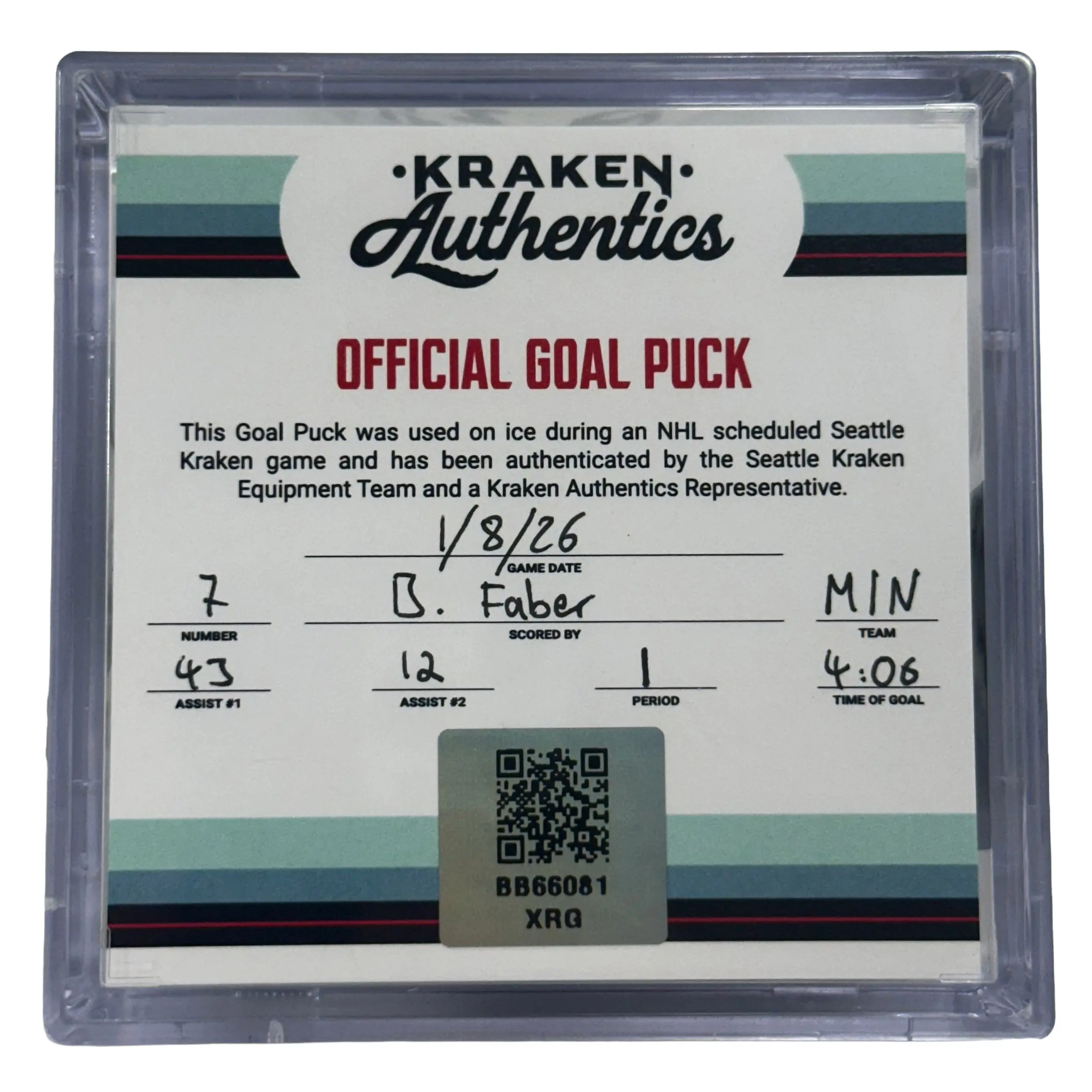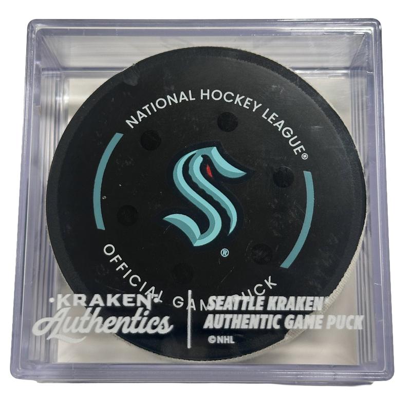 Official game-used goal puck from the Seattle Kraken vs. Minnesota Wild game on January 8, 2026.
