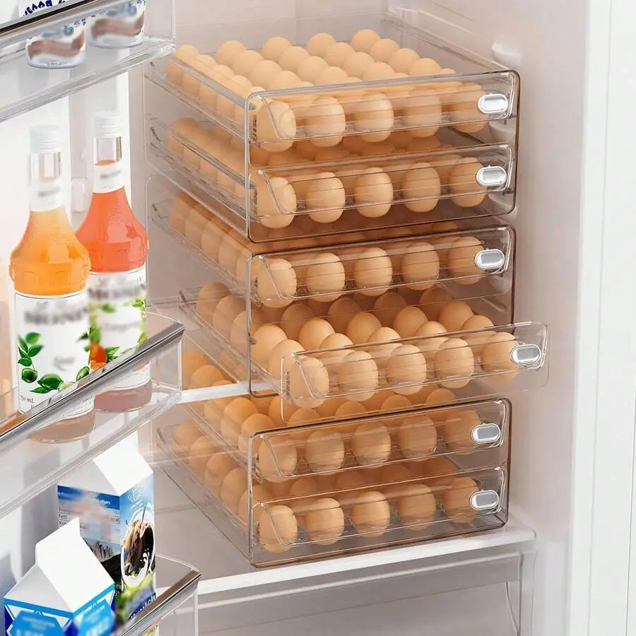 Keep your eggs secure, organized, and easily accessible with this multi-layer egg storage set!Designed forrefrigerators, kitchens, or pantries, this PET plastic egg tray features a drawer-style design for effortless use and stackable layers to save space.