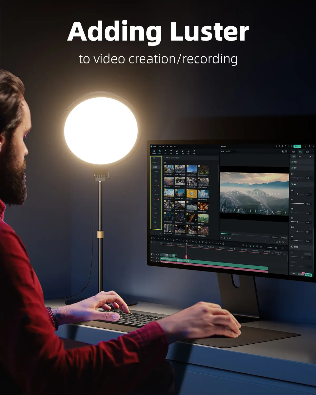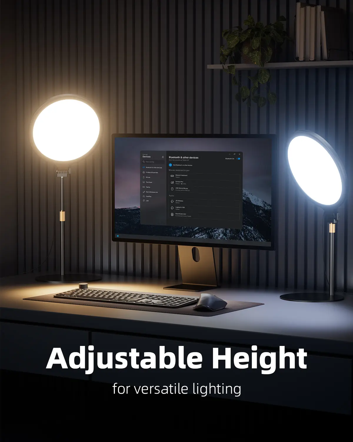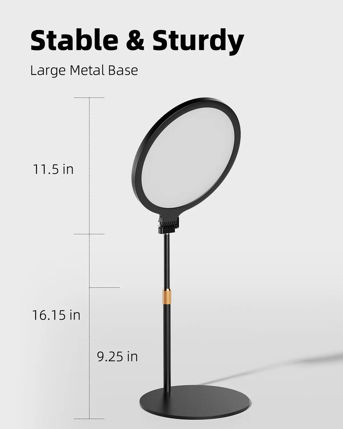 ·FLEXIBLE ADJUSTMENT: FULL-SCREEN Ring light for desk with metal telescopic pole can easily adjust from 21" to 27" (Stand Base to Light Head) and light head with 180° adjust perfect angle. allowing you to adjust it back and forth, left and right, or up and down for perfect illumination. Ideal for computer light for laptops, desktops, camera, webcam light and monitors, ensuring your workspace or computer camera setup is well-lit, fit for influencers and content creators