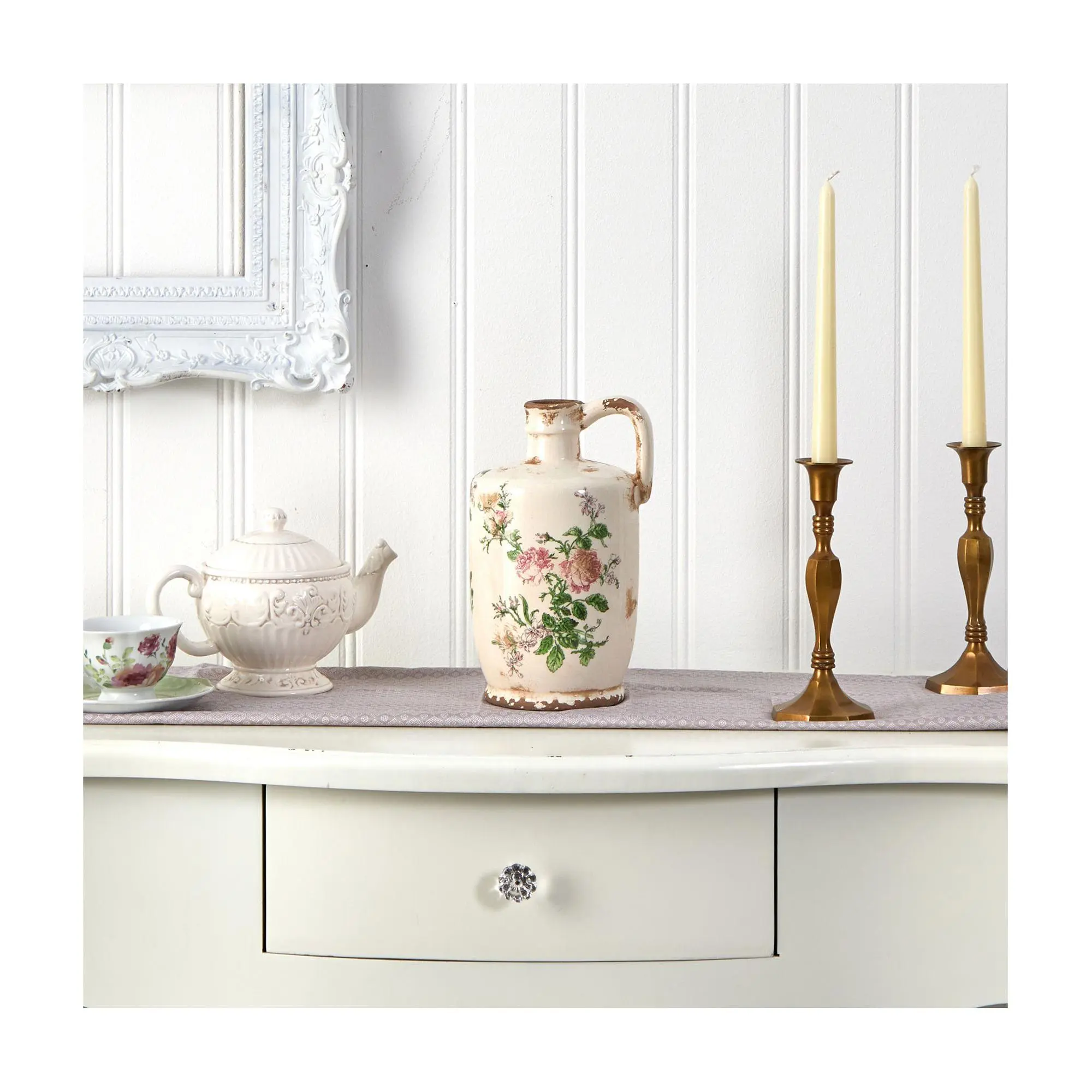 Bring a touch of Tuscan charm into your home with this beautiful pitcher. Perfect for displaying your favorite faux flowers, this vintage-inspired ceramic planter adds a cozy, country chic vibe to any space with its delightful floral design set against a rustic backdrop. Ideal for indoor use, it's a delightful way to freshen up your decor with that farm-to-home style. From Nearly Natural.