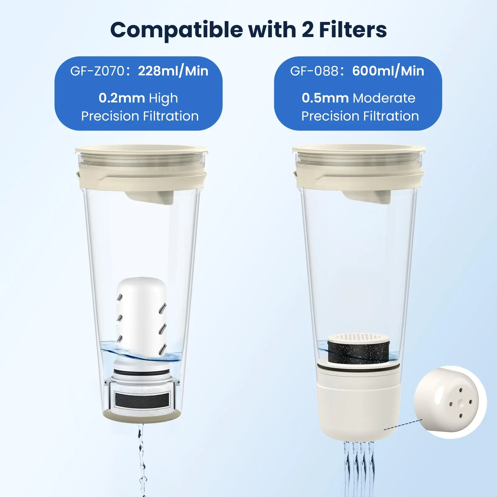 ·Two Filtration Options: We provide two distinct filter to meet specific needs. For those seeking speed and enjoy refreshing water without delay, our activated carbon filtration (GF-088) is designed for a high flow rate. If you prioritize exceptional filtration, our ultrafiltration option (GF-Z070) offers a precision of 0.2 microns, ensuring that your water is not only clean but also free from impurities that can affect taste. Simply search 'GF-088' for our fast-flow solution or 'GF-Z070' for our high-precision filtration