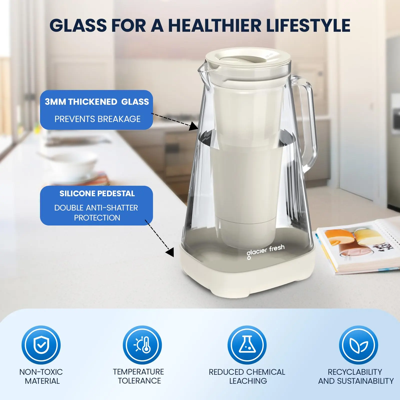 ·Glass Safety in Design:Our glass water pitcher is meticulously designed with 3mm thickened, high-borosilicate glass, which offers a reinforced barrier against breakage. The base is cushioned with a silicone pad for extra security. The glass filtered water pitchers arrives in a protective corrugated box to ensure the glass reaches you in pristine condition. If, however, you encounter any damage upon arrival, please reach out to us, and we will swiftly address the issue with the utmost priority