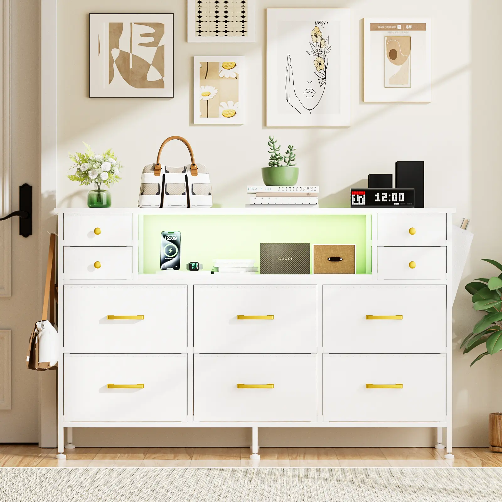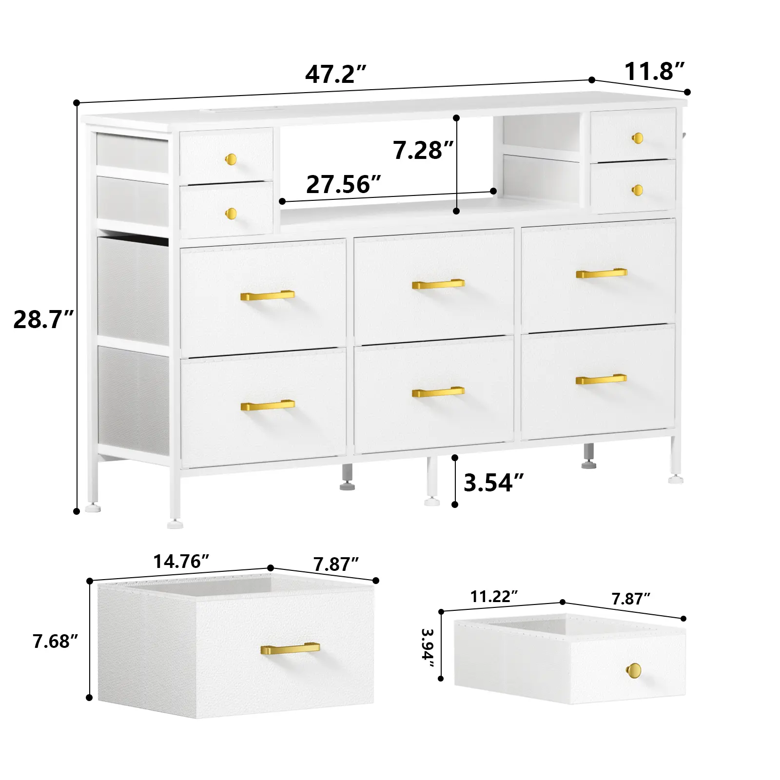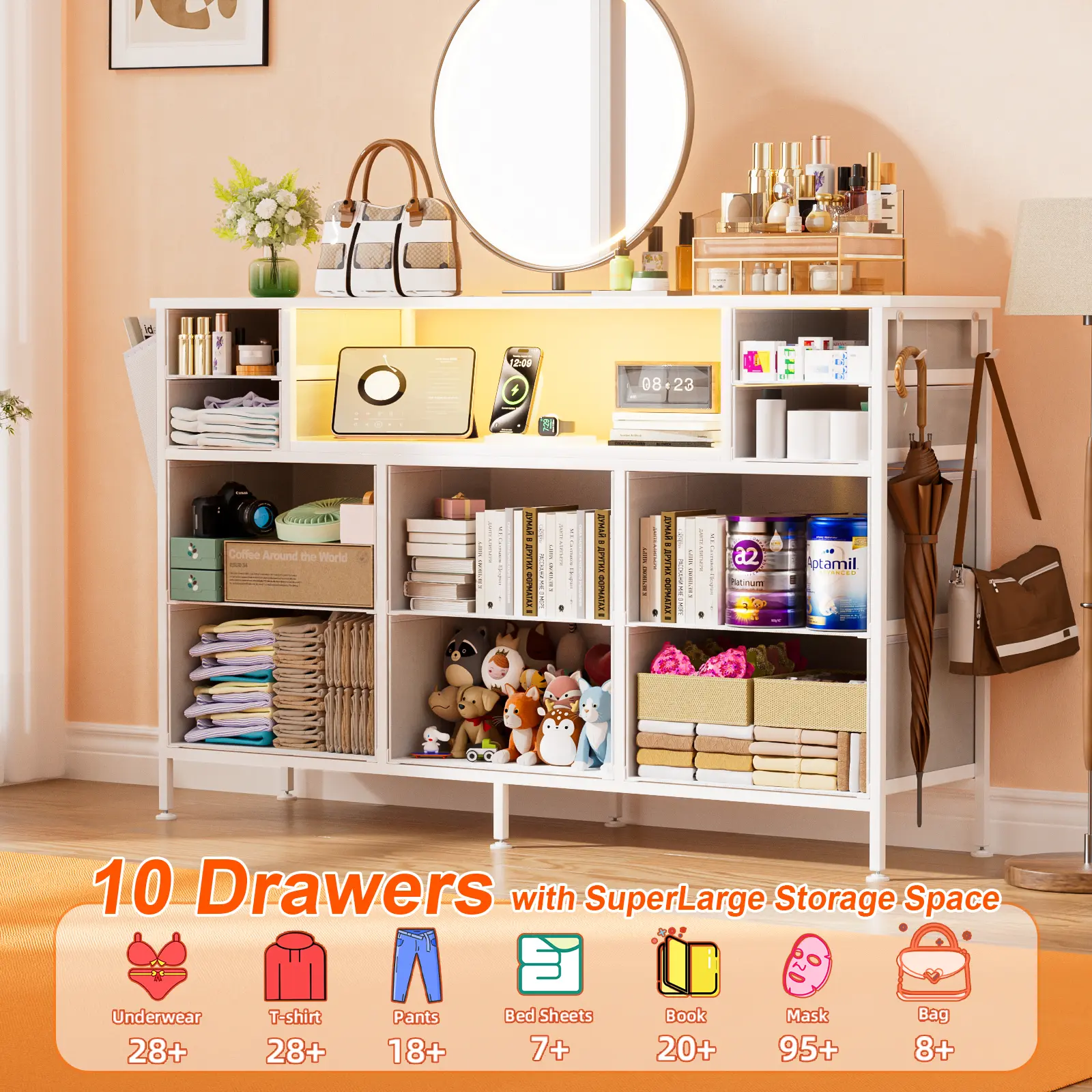 • Designed with 10 deep, removable fabric drawers, this dresser offers generous storage for clothing, accessories, and daily essentials. The open middle shelf and wide wood top add convenient surface space for displaying lamps, books, or décor items. Perfect for organizing your space efficiently.