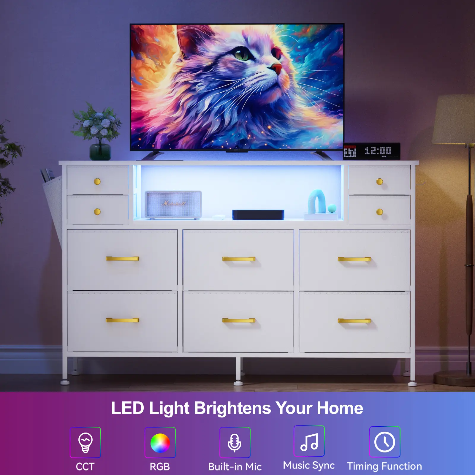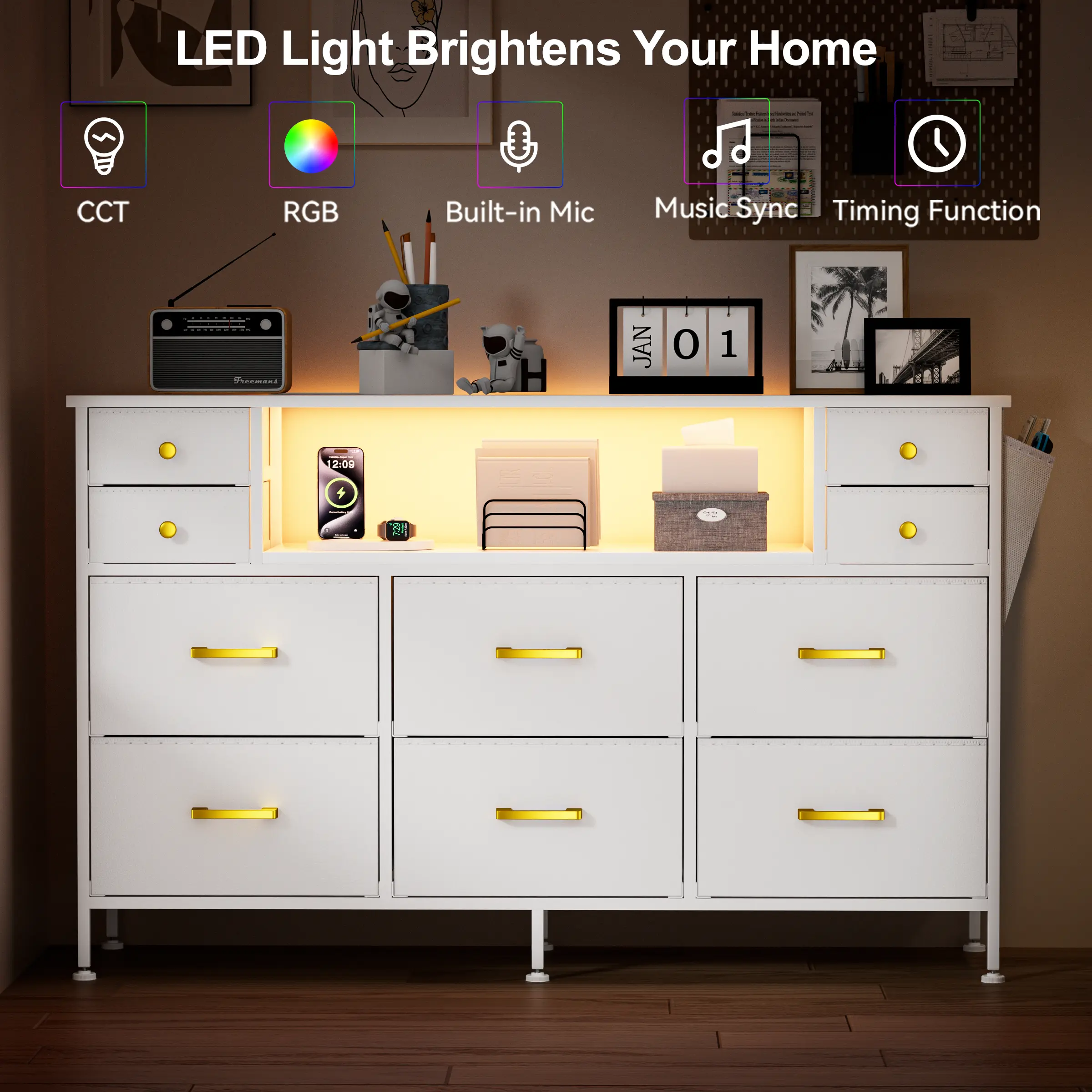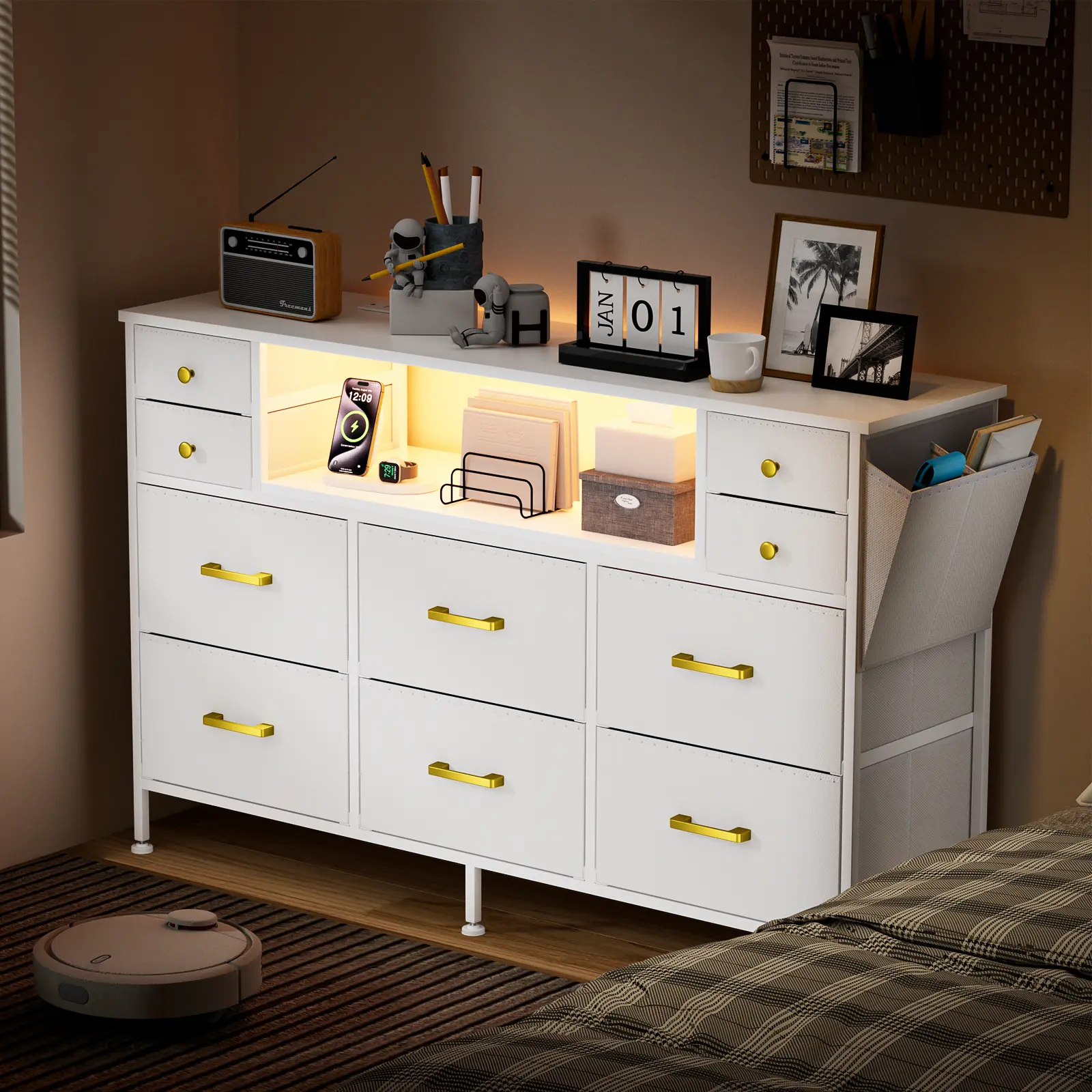 • Designed with 10 deep, removable fabric drawers, this dresser offers generous storage for clothing, accessories, and daily essentials. The open middle shelf and wide wood top add convenient surface space for displaying lamps, books, or décor items. Perfect for organizing your space efficiently.