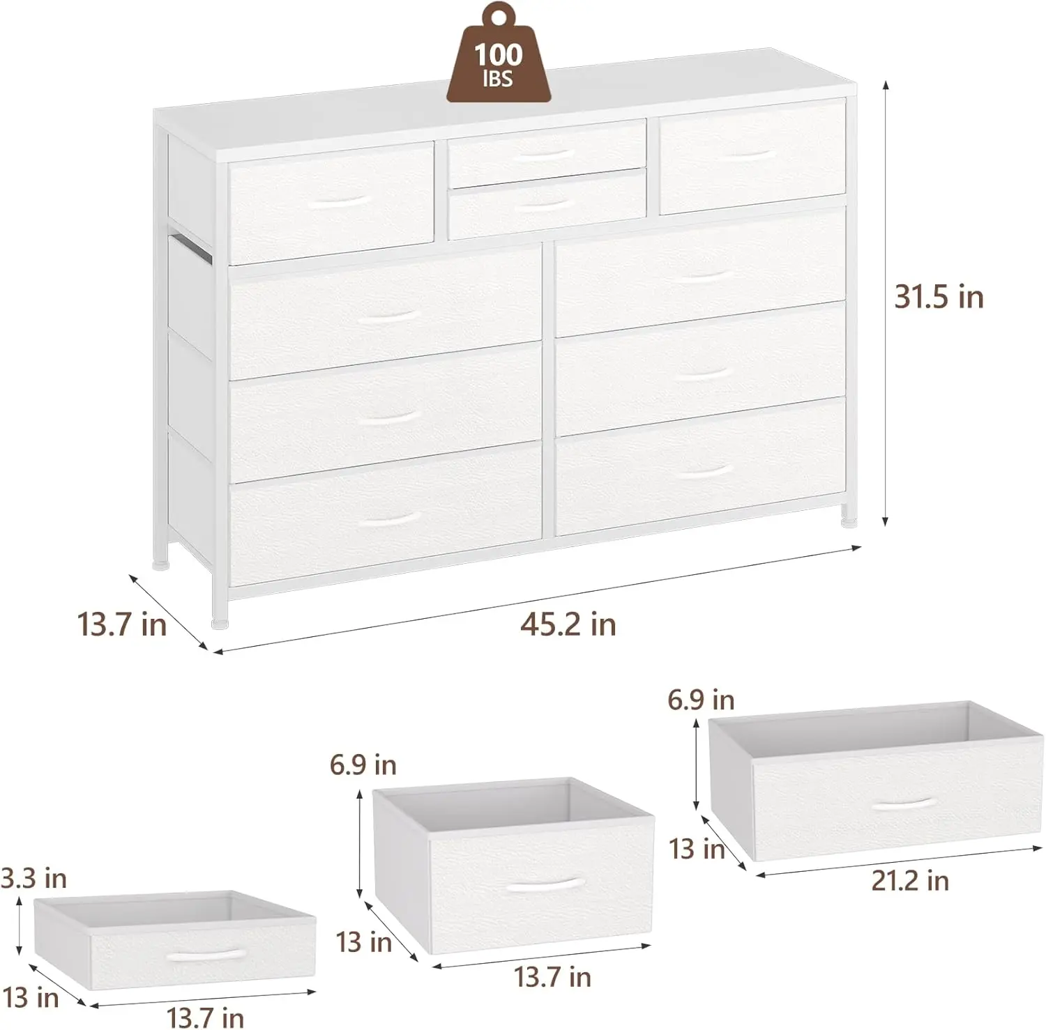 ·【Generous Dimensions】 Measuring 45.3"W x 13.8"D x 31.5"H, this bedroom dresser offers substantial storage space. The large drawers measure 21.2”L x 13”D x 6.9”H, while the medium and small drawers provide additional options for organizing like socks and undergarments efficiently.
