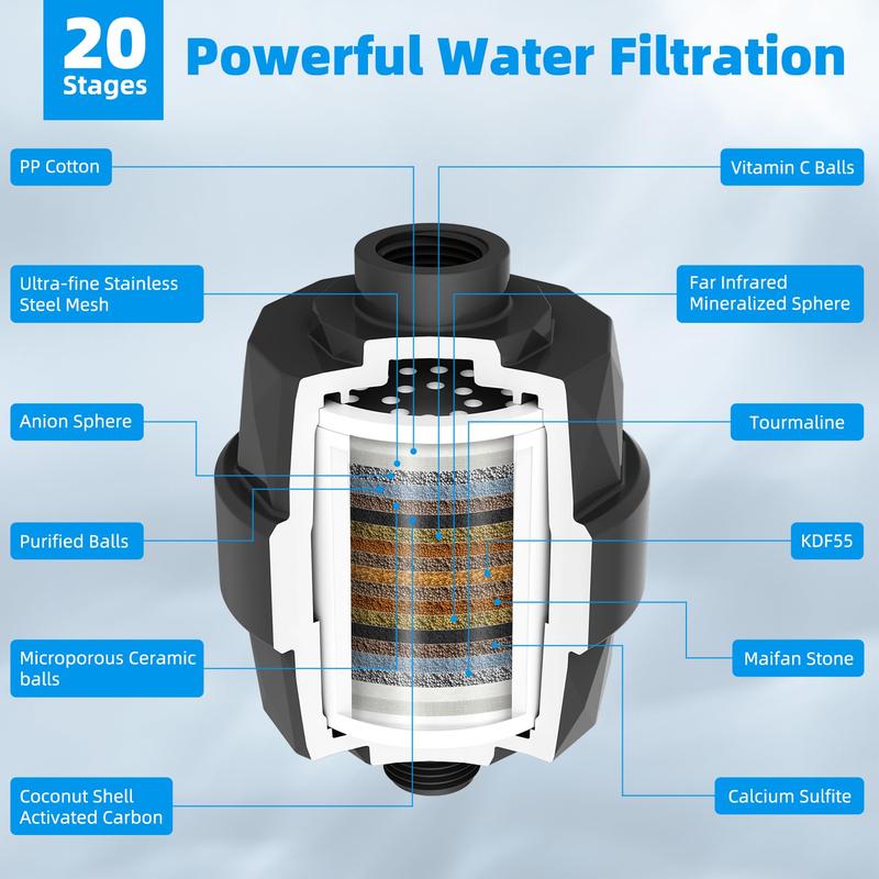 Ā·20 Stages Shower Head Filter: Hibbent advanced shower filter with 20-stage water filtration, redox media, calcium sulfite, activated carbon, and ceramic beads provides the ultimate water purification. It effectively eliminates odours, balances pH levels, and infuses beneficial minerals into your skin, nails, and hair from the moment you start using it! This innovative filter also acts as a moisturizer and purifier, while providing an unparalleled sensation for sensitive skin.