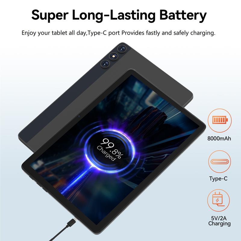 【8000mAh Large Battery & 13MP + 8MP Dual Cameras】10 in android tablet equiped with 8000mAh large capacity battey for long time use and longer standby time.Convenient to charging via Type C USB cable,you're powered up swiftly, wherever you are.Providing a long-lasting reading and watching times,enjoy your favorite activities and apps for longer. The front 8MP and rear 13MP cameras can easily satisfy video calls, online learning, etc. It is also a good choose use it for online lesson and do school work.