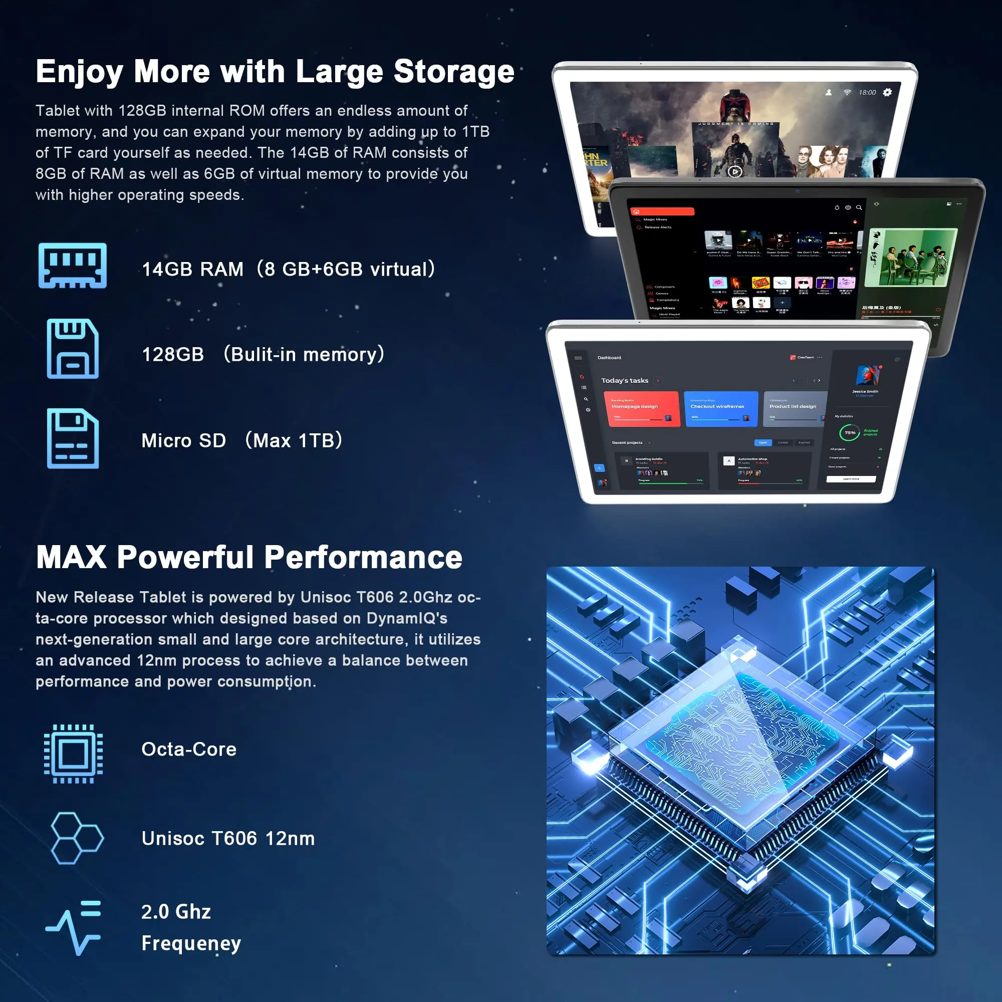 【Robust 14+128 GB Storage 1TB Expandable】: Android tablet equipped with a substantial 14 GB (8+6virtual) of RAM and 128 GB of internal storage, this tablet handles large-scale applications and multitasking with ease. Whether you're streaming, or managing extensive data, it provides ample space and speed to meet all your needs without lag. What's more, tablets support up to 1TB micro sd card.
