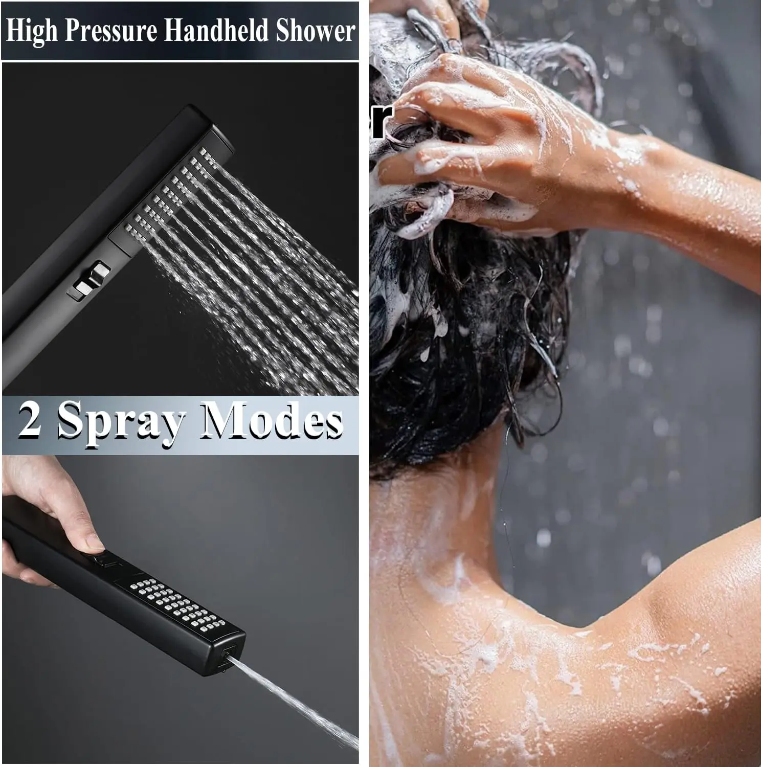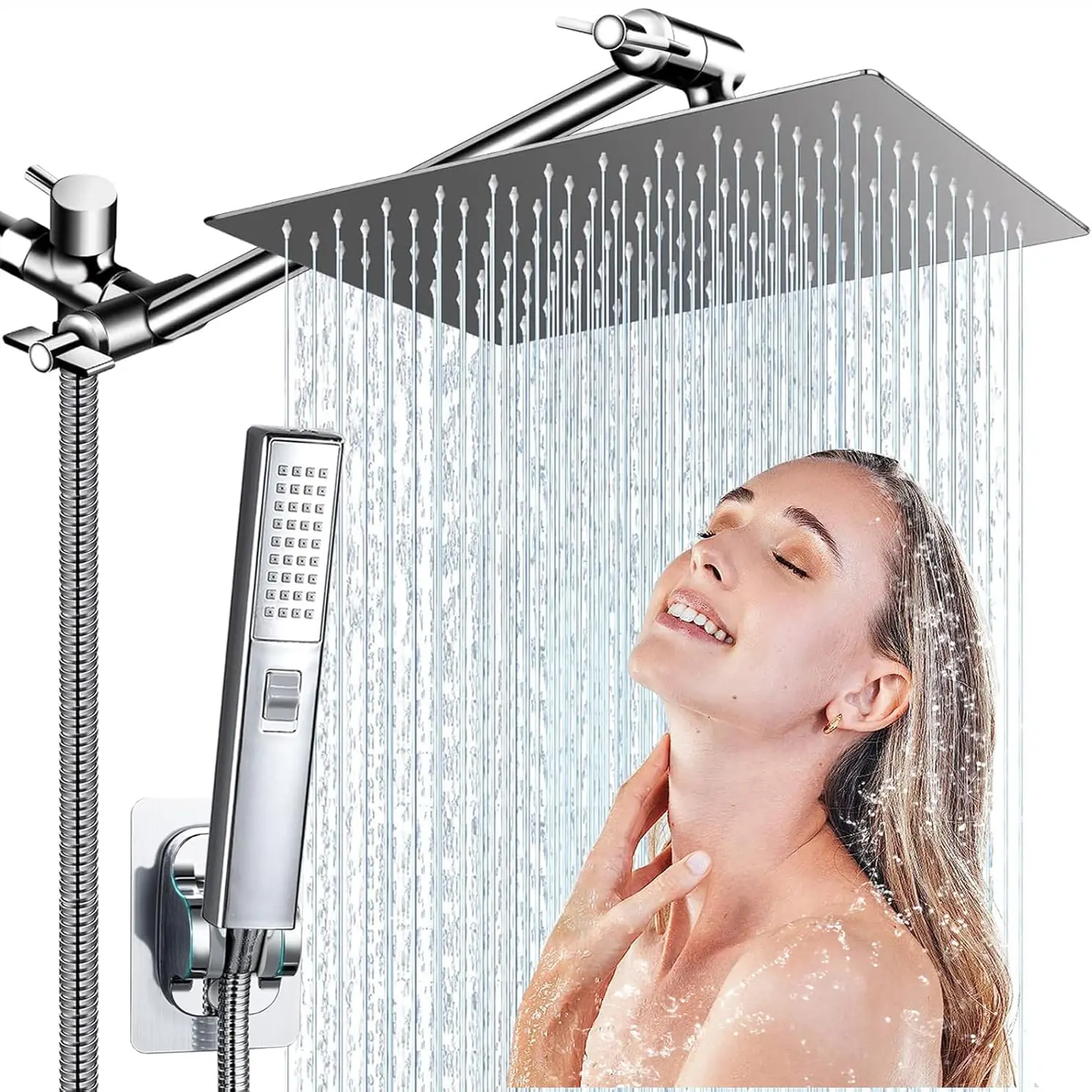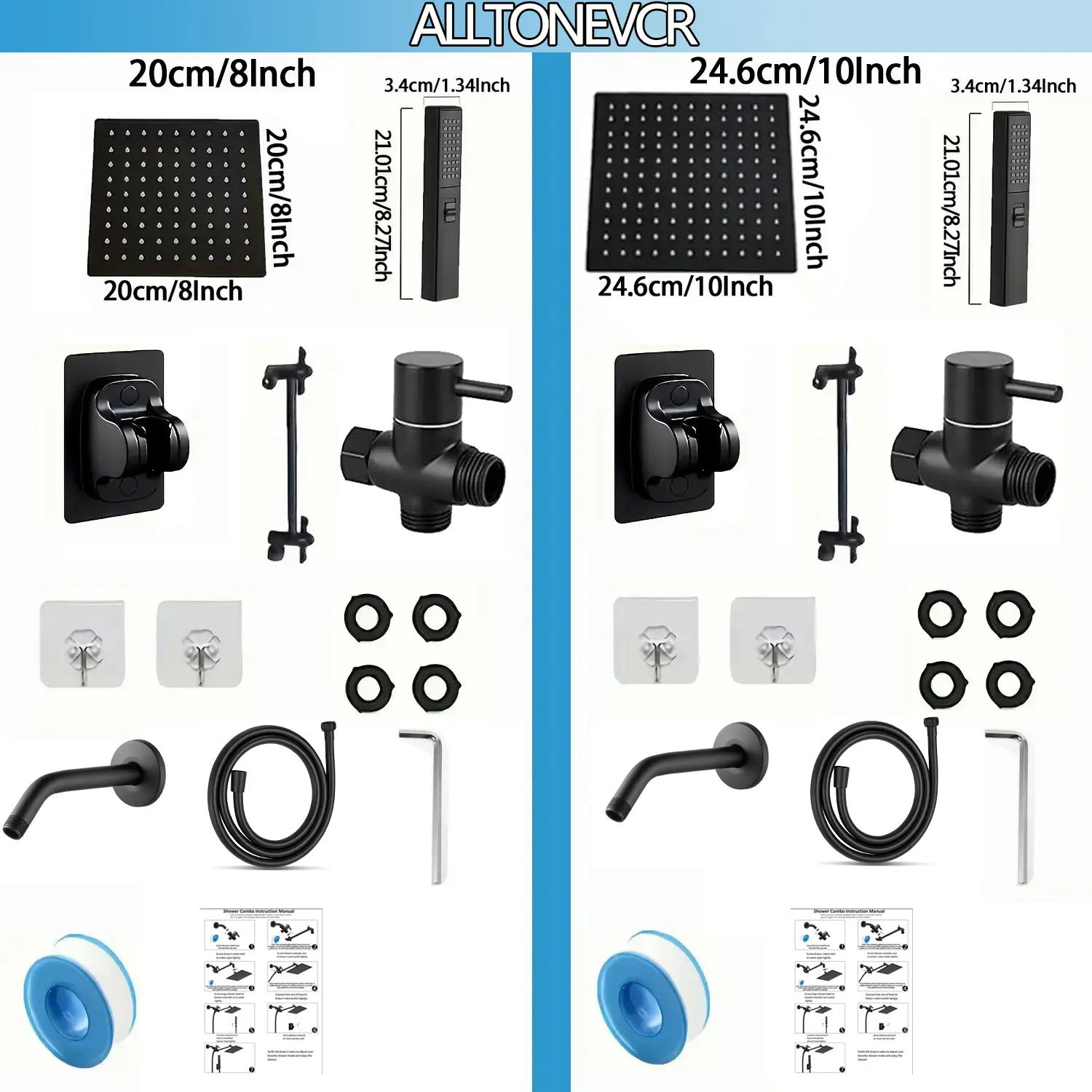 【10'' High-pressure Rainfall Shower Head】 10” square rainfall showerhead made from Stainless Steel with Black Finish for the highest rust resistance and longevity.Using ultra-thin design and advanced air booster technology .Come with filter and washer insure reliable leak-proof connection.360 rotation angle-adjustable solid ball joint nut, meets different angle position shower needs.You can use each shower head separately or both shower heads together.