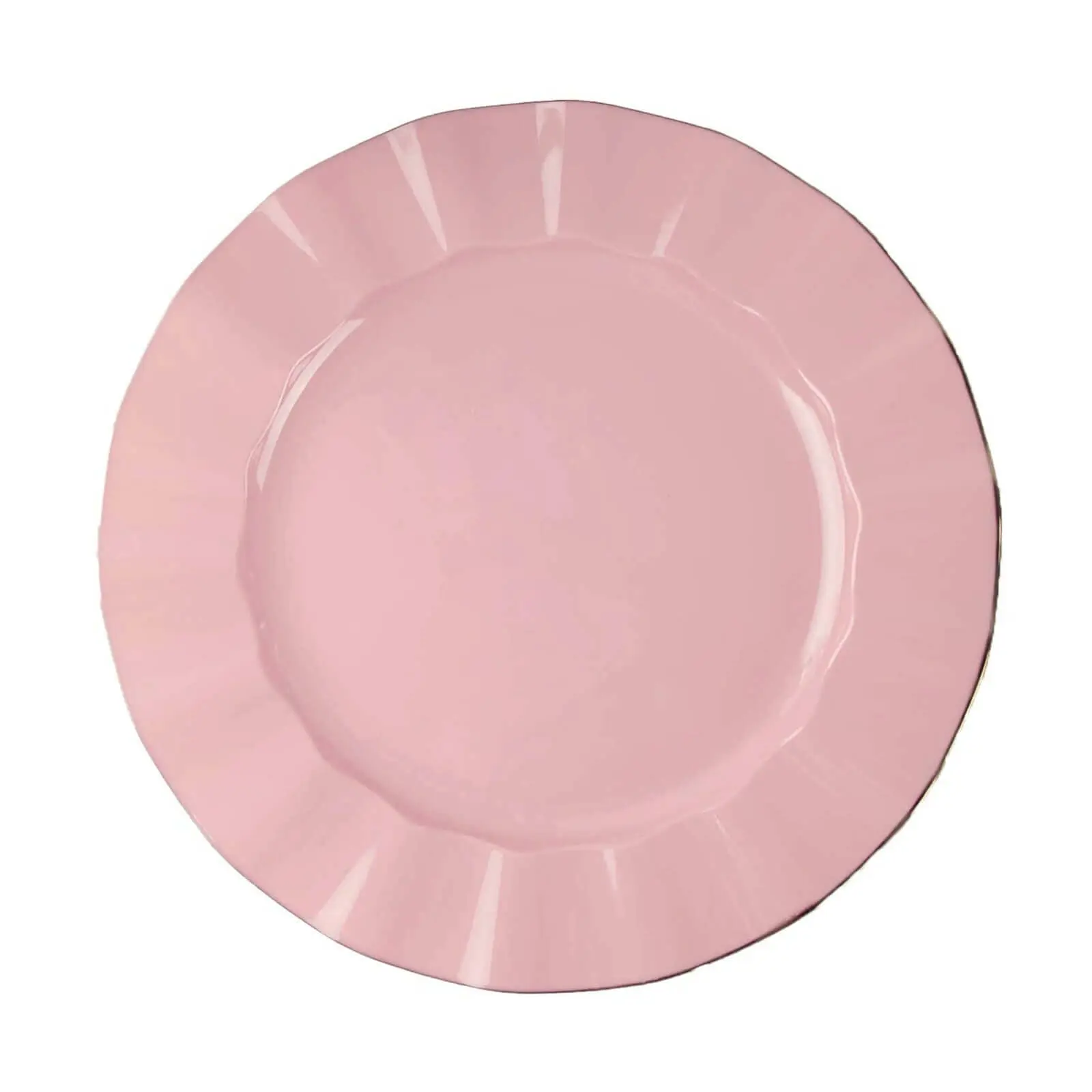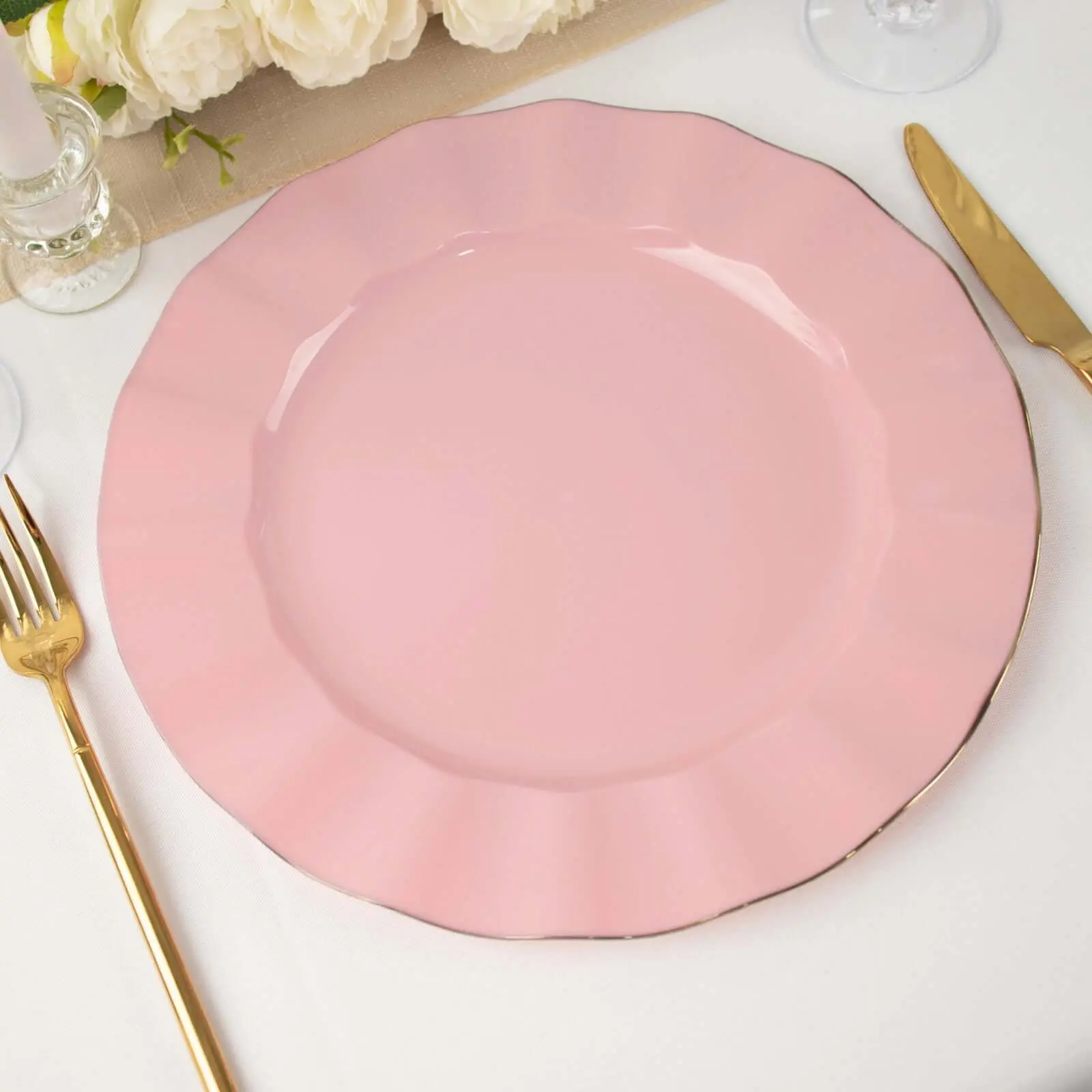 10-Pack Plastic 11" Round Dinner Plates in Dusty Rose Ruffled Rim with Gold Edging - Sturdy Disposable Dinnerware