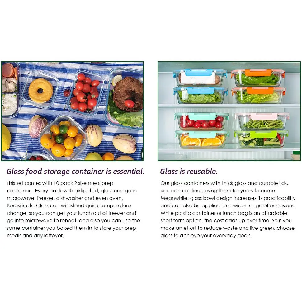 5. 10 Pack Glass Food Storage Containers with Lids Leakproof, Airtight Glass Meal Prep Containers For Lunch, On The Go, Leftover, Dishwasher Safe