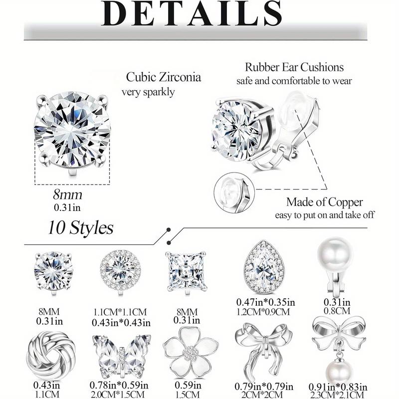 ·Silver Clip on Earrings for Women: Elevate your style with this elegant set of 10 pairs of silver clip on earrings, perfect clip on earrings for non-pierced ears. The clip on earrings set includes 4 pairs of sparkling cubic zirconia clip on earrings (round, square, halo round, and halo teardrop), 1 pair of classic pearl clip on earrings, 1 pair of dangle pearl earrings with a bow, 1 pair of bow clip on earrings, 1 pair of butterfly clip on earrings, 1 pair of flower clip on earrings and 1 pair knot clip on earrings. These versatile clip on earrings silver are a must-have for any woman’s jewelry collection, offering styles to suit every occasion