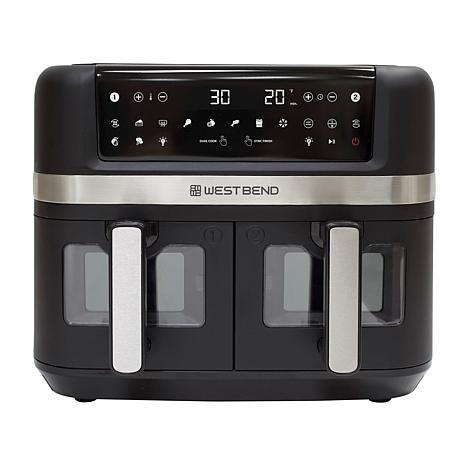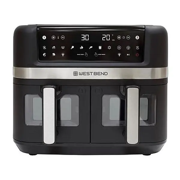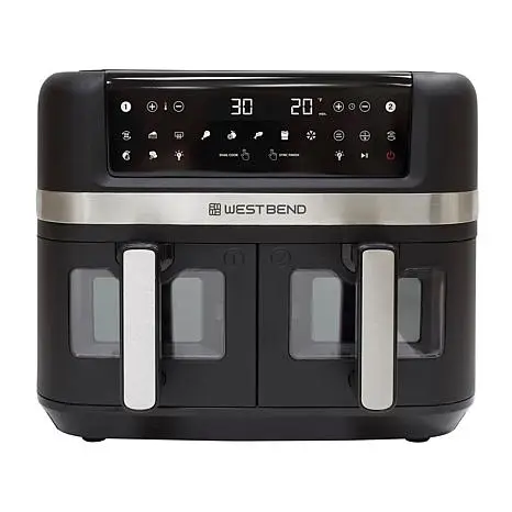 West Bend 10-Quart Dual Zone Air Fryer West Bend's 10 qt. Dual Zone Air Fryer provides a quick and convenient way to cook delicious, healthier meals. Whether you want to make two baskets of delicious fries or cook two foods, two ways, for a complete meal, this dual-basket air fryer eliminates back-to-back cooking, helping you save time. Cook your favorite foods to crispy perfection with 15 one-touch preset functions (Air Fry, Bake, Broil, Chicken, Dehydrate, Fish, Fries, Frozen, Keep Warm, Preheat, Roast, Reheat, Dual Cook, Sync Finish and Vegetables). Dual Cook lets you double up on your favorites: set one basket, then mirror the settings on the other basket by pressing the "Dual Cook" button. (Easy, right?) And with Sync Finish, you can cook two meals, two ways and have them done at the same time. All the functions are arrayed on a touchscreen LED digital interface that's easy to read and access, while you're cooking. The frying baskets feature an easy-view clear window, so you can keep an eye on your favorite recipe as it cooks. The baskets are made with nonstick coating, providing durability and preventing foods from sticking, making for easy cleanup. Maybe best of all, it fits on your countertop, crafted with a sleek look that complements any kitchen décor. With a temperature range of 90 to 400 degrees F, and 1,600 watts of cooking power. What You Get 10 qt. Dual zone air fryer (2) Air fry baskets (2) Air fry racks Grill rack Use & care guide