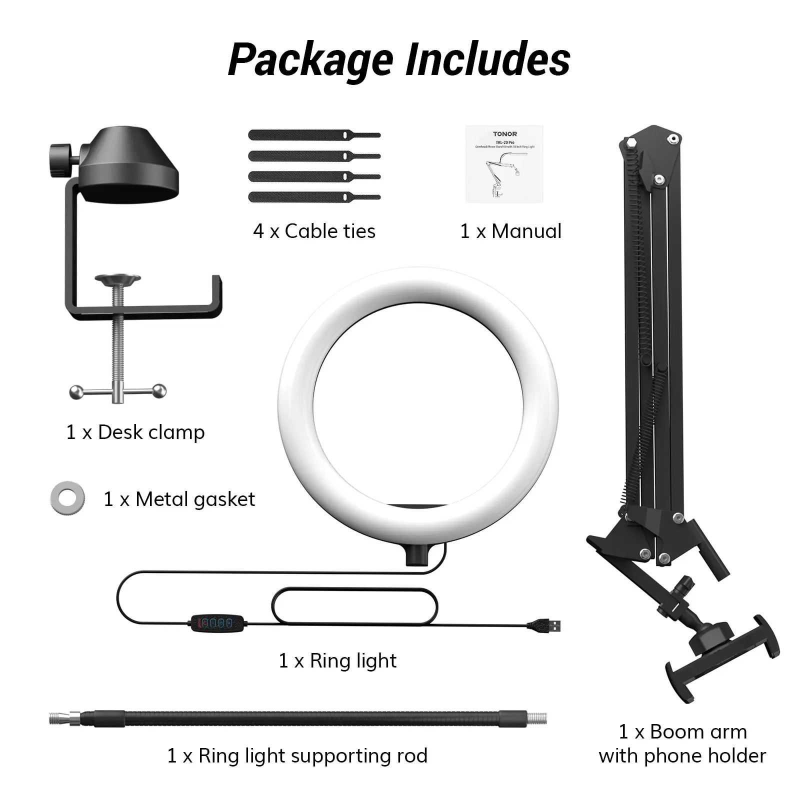 Inside the box, you'll find the 10" ring light, adjustable boom arm, phone holder, reinforced clamp, and cable ties—everything you need to shine bright. Ready to light up your content? Grab the TONOR ring light and start creating with confidence today!