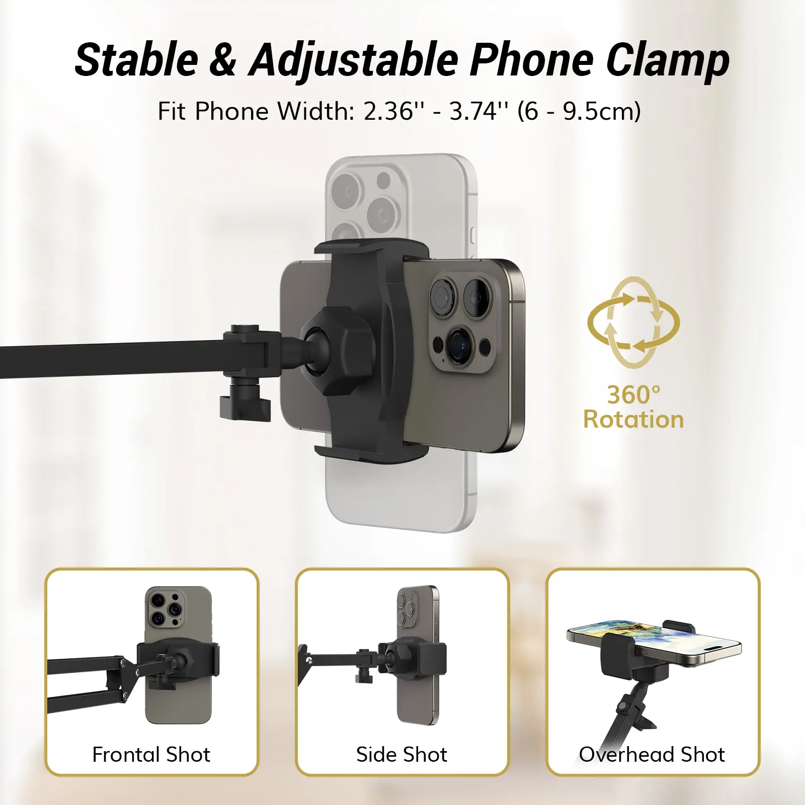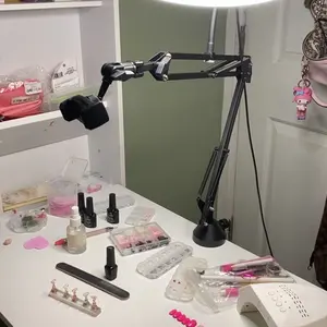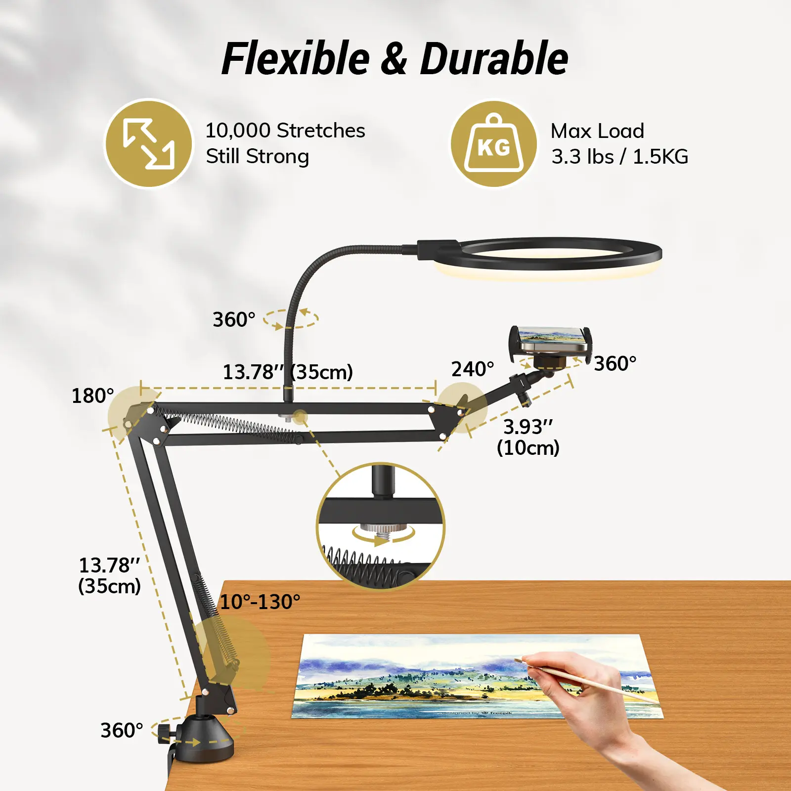 The kit includes a flexible boom arm and a phone holder that extends up to 3.93 inches, giving you full control over your shooting angles. The sturdy clamp with metal pads keeps everything stable on your desk, while included cable ties help you keep cords tidy and out of the way. Plus, the adjustable stand reaches up to 5.5 feet tall, making it versatile for any setup.