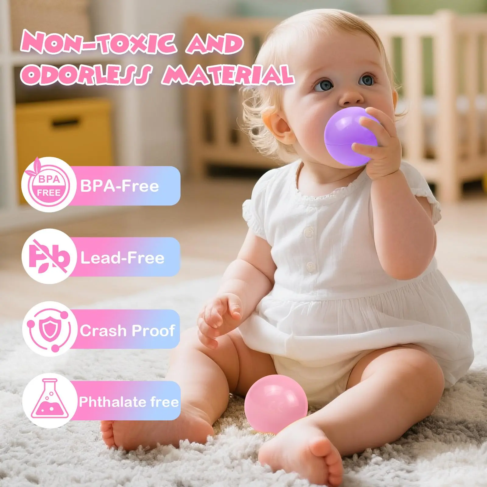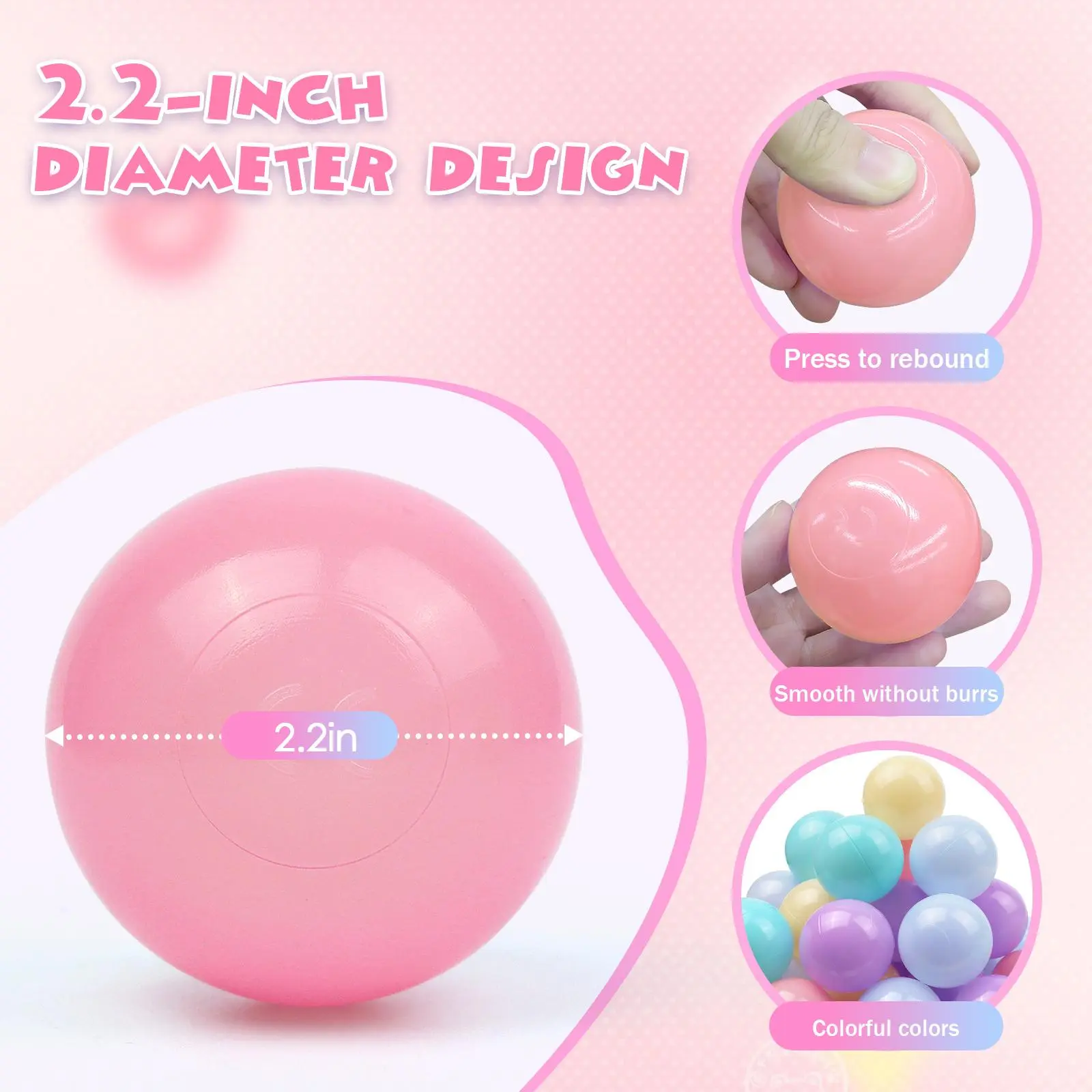 100% Non-Toxic, BPA & Phthalate-Free- Ultimate safety for your little explorers: Our ball pit balls are crafted from these materials, passing the strictest safety tests. Sized at 2.2 inches in diameter, they’re large enough to prevent choking while still being easy for tiny hands to hold. The smooth, seamless surfaces eliminate any risk of cuts or scratches, ensuring your kids can dive into the ball pit.