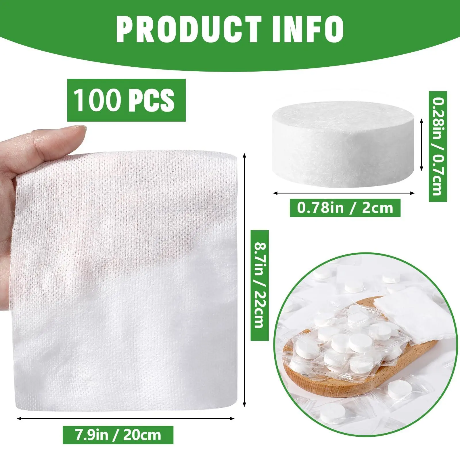 【100PCS Compressed Towels】Package includes 100pcs disposable compressed towels. Each compressed towel unfolded Size is 7.9in x 8.7in, These compressed face towel are all individually packaged and made of plant fibers. Due to the small size and strong water absorption of compressed coin tissue, there is a risk of suffocation.
