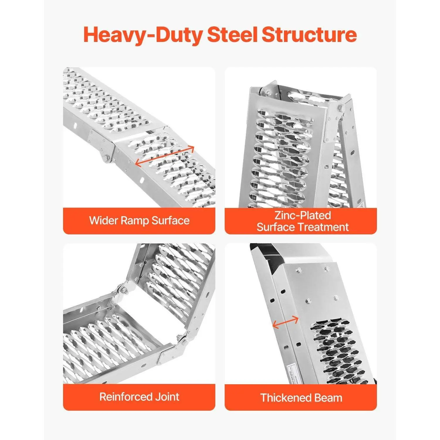 ·Steel Ramp: The all-steel construction features precision welding with tightly sealed joints, a white zinc-coated surface for corrosion-resistance, and a smooth, burr-free finish. The thickened, widened ramp surface ensures even weight distribution, avoiding bending or collapse during long-term use.