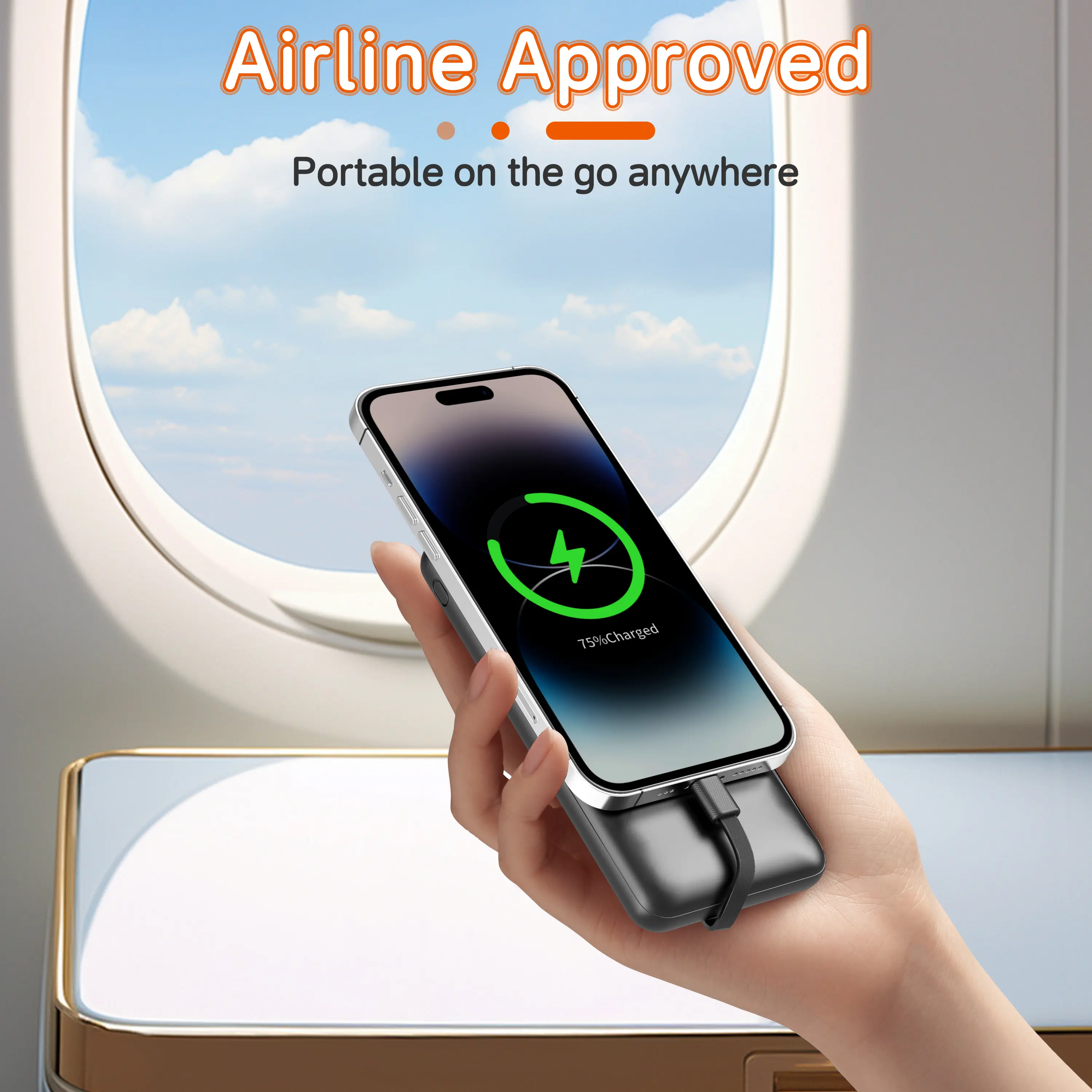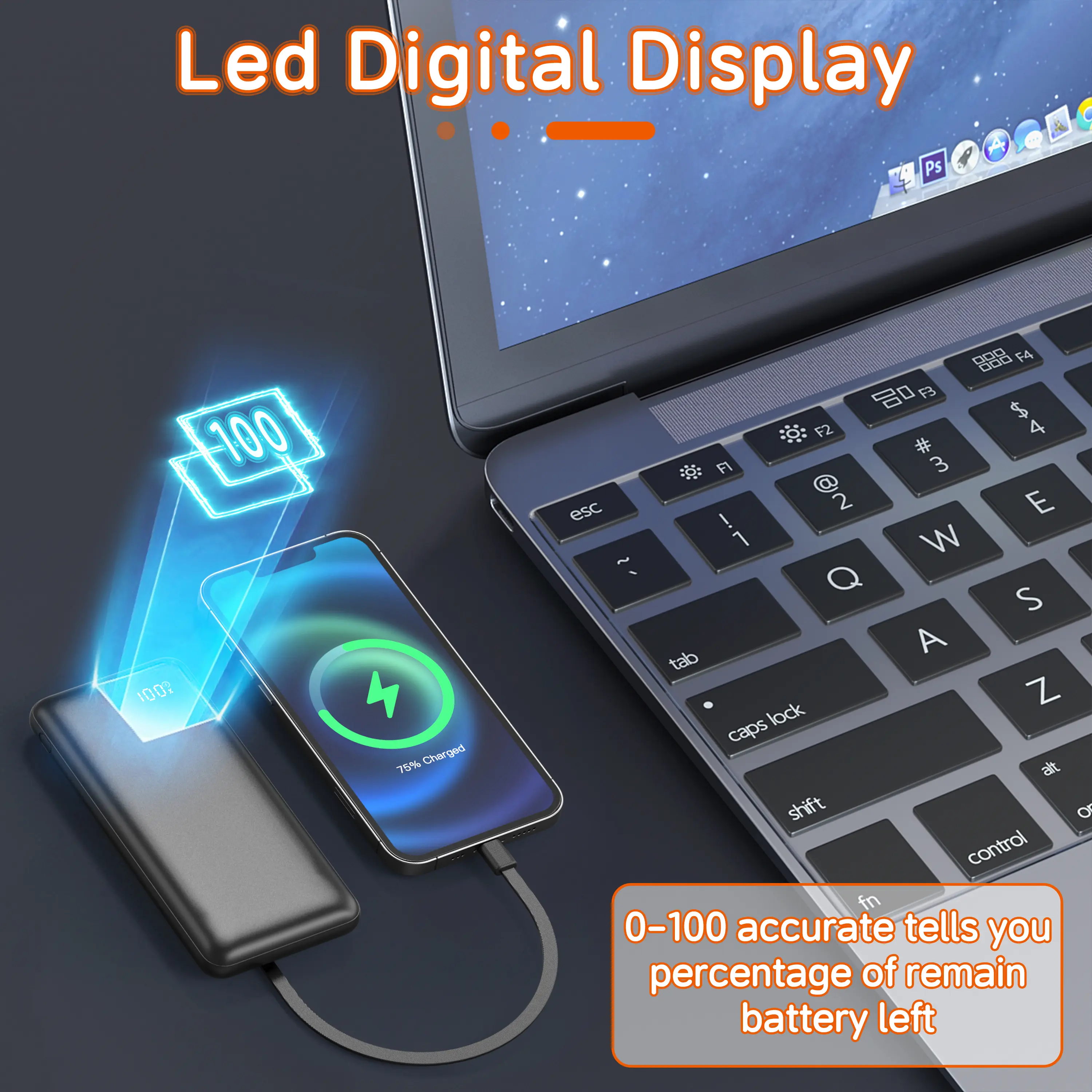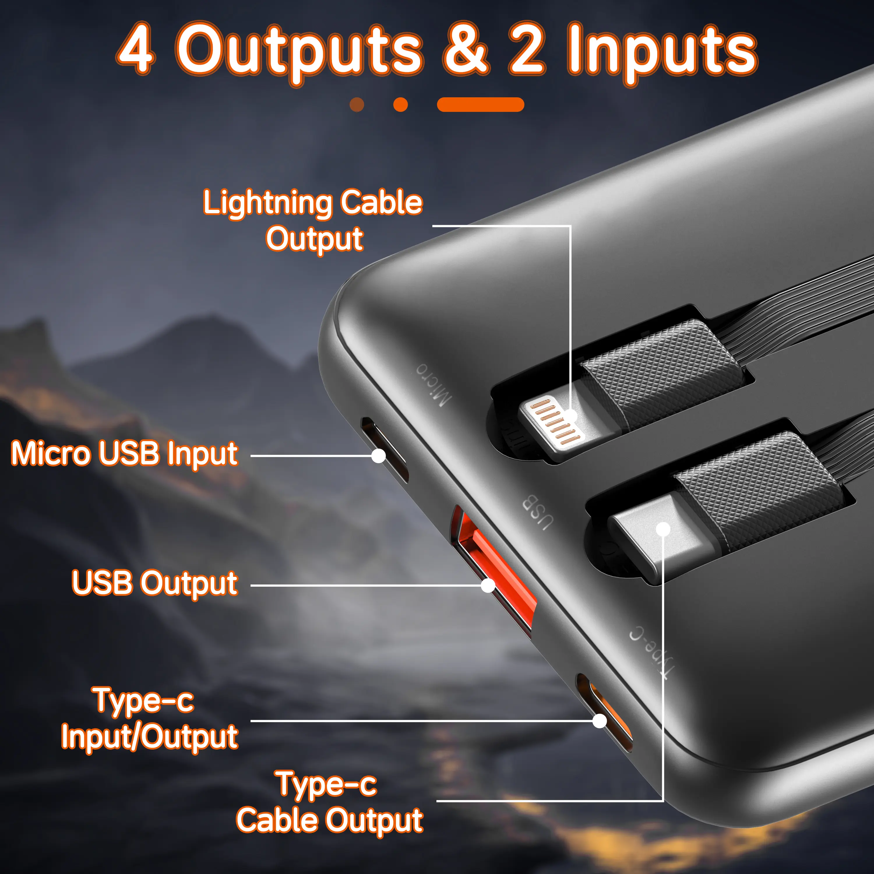Never worry about low battery again with our ultra-slim 10000mAh Portable Charger! Featuring built-in Lightning & USB-C cables, this power bank is your ultimate on-the-go charging solution. No extra wires, no hassle â just plug and play!