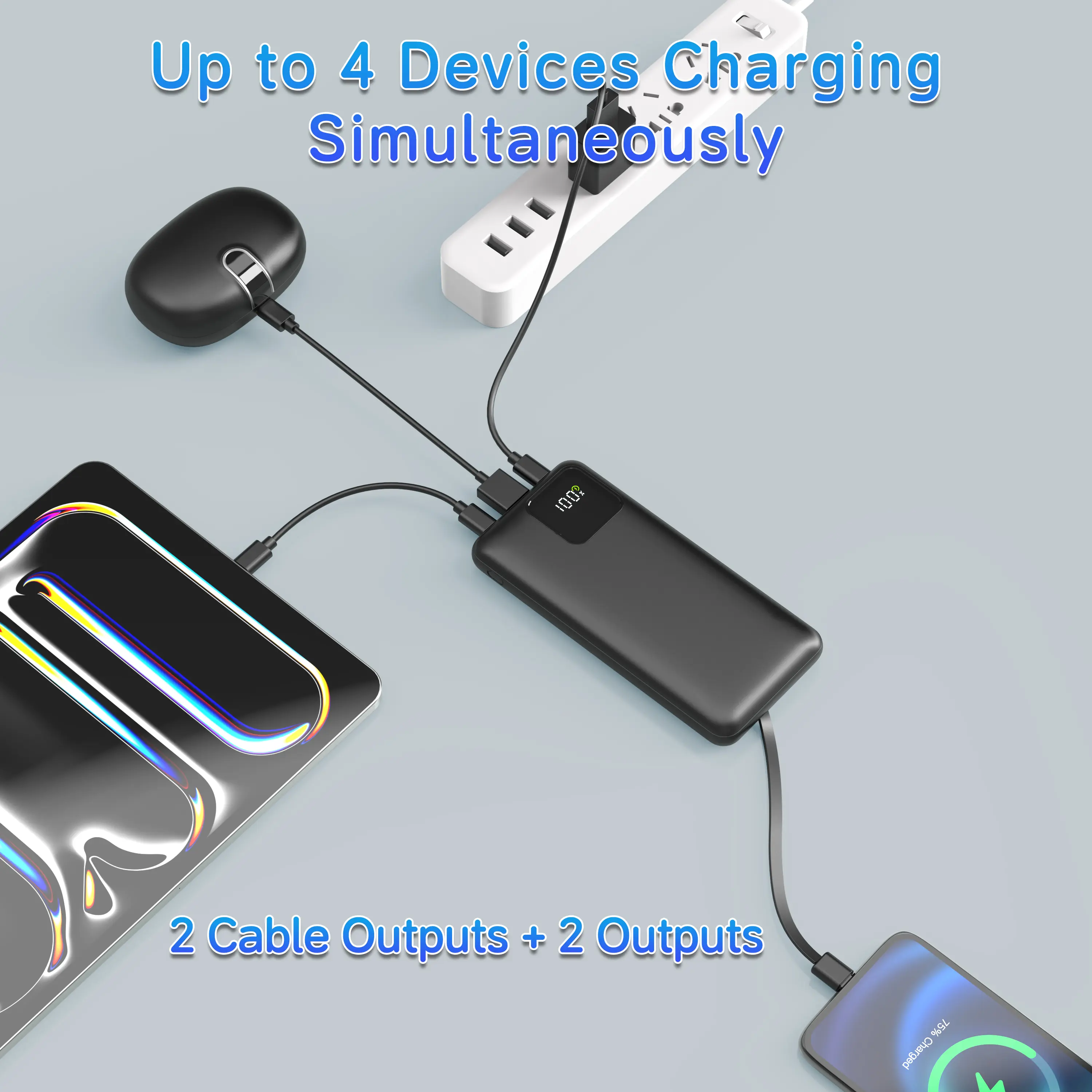 No Extra Cables Needed Integrated Lightning & USB-C cables let you charge iPhones, iPads, Android phones, and more—no need to carry extra cords. Charge 4 Devices at Once Equipped with 2 built-in cables + 2 USB output ports, plus dual input options (USB-C & Micro USB) for easy recharging. Slim & Travel-Ready Smaller than most smartphones (5.7” x 2.68”) and just 0.52 lb, this power bank fits easily into any pocket or bag. Smart LED Display See exactly how much power you have left—real-time battery status takes out the guesswork. Wide Compatibility Perfect for iPhone 16/15/14 series, Samsung Galaxy S22/S21, Google Pixel, Motorola, and more USB-C/Lightning devices.