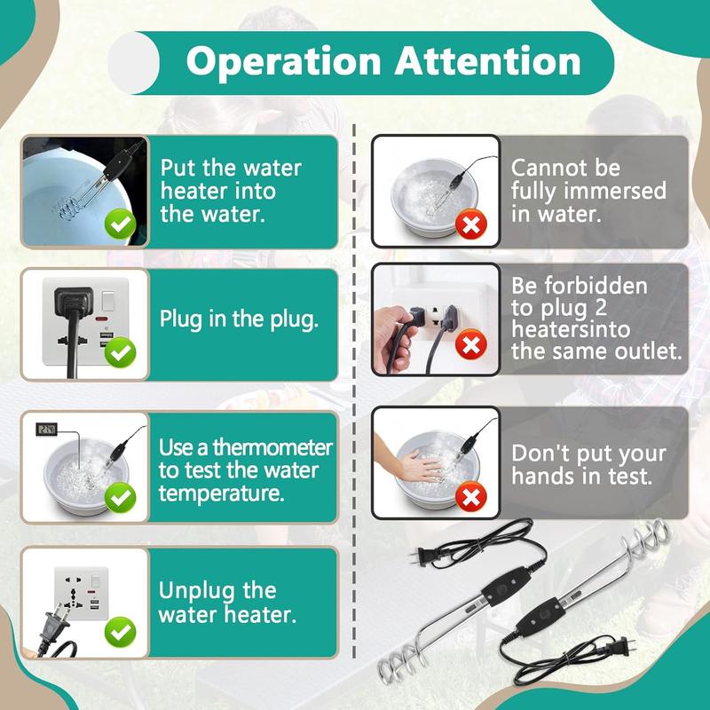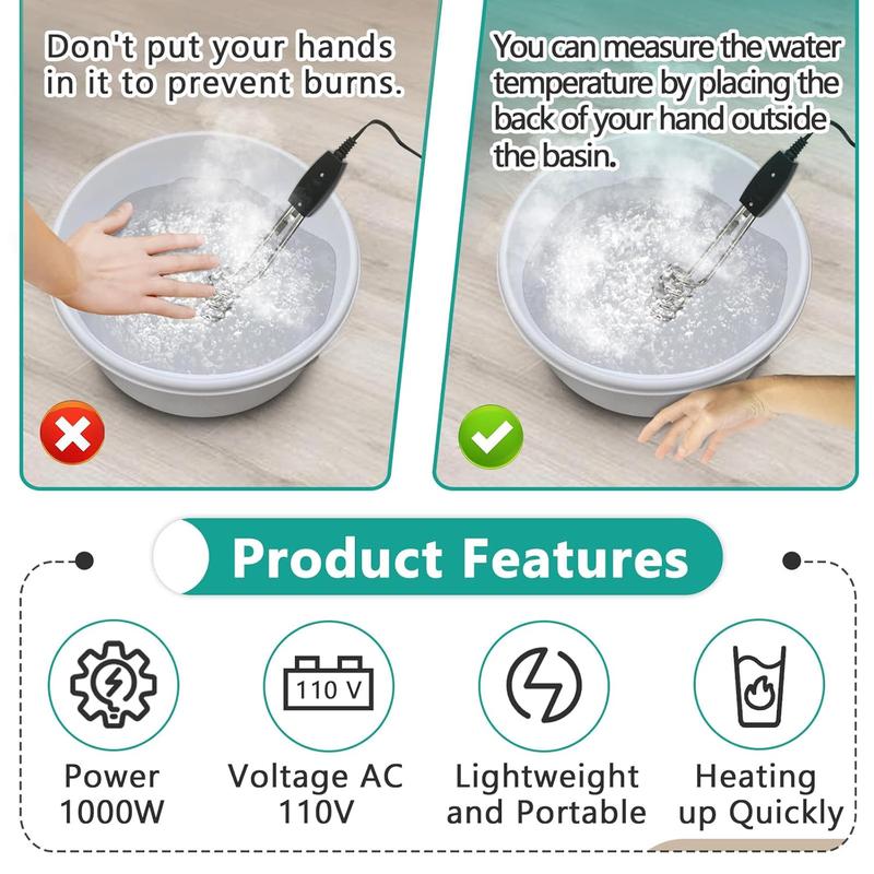 Easy to Use: Portable water heater in water at the appropriate level, plug it in and use a to observe the water temperature, unplug the power, wait for a few seconds, and then remove it from the water