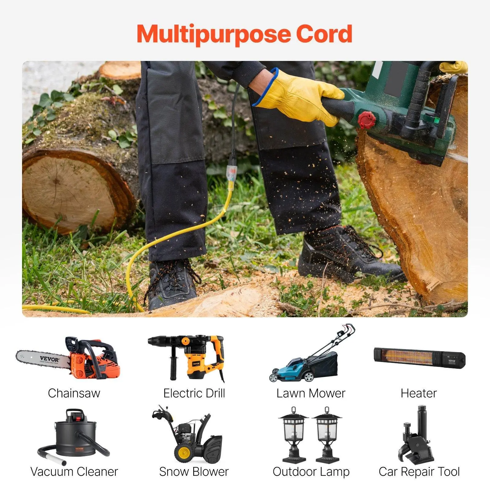 ·Multipurpose Cord: 100FT Length, 12AWG, 15 Amps, 1875W, 125V, 3-Prong Grounded Outlet. This heavy-duty extension cord powers a variety of appliances — chainsaws, electric drills, lawn mowers, shop vacuums, outdoor lamps, angle grinder, etc, providing stable and reliable power for both outdoor and indoor use.