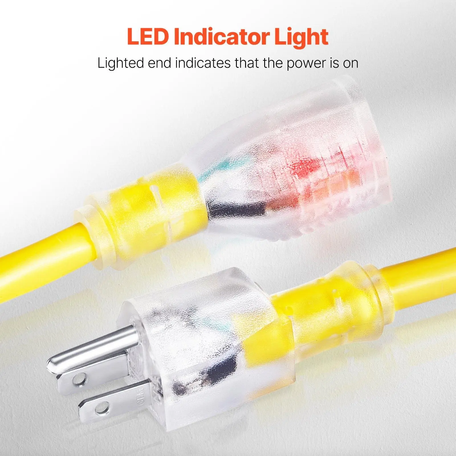 ·Lighted End: Our heavy-duty extension cord features an LED indicator at one end that illuminates when powered, making it easy to check the power status in low-light conditions and enhancing the user experience.