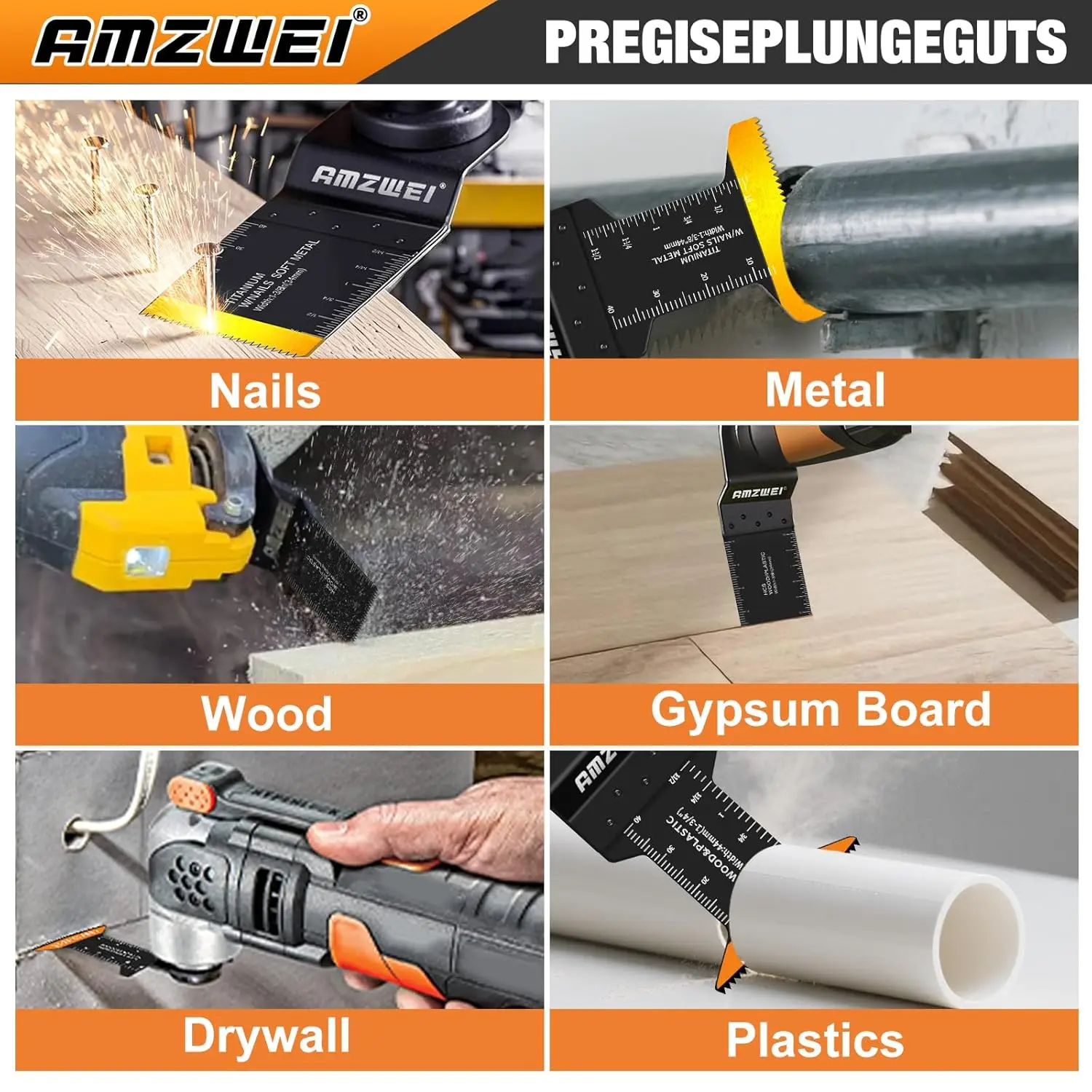 [100PCS Oscillating Tool Blades Set]A totally cost-effective tool set including 4 different blades.6Pcs Titanium blades, 47Pcs curved edge HCS blades and 47Pcs HCS blades, you're equipped for any cutting challenge. [Precision Cutting with Curved]Innovative curved edge can enhance stability during use, make cutting faster and more accuracy and provide a better way to start cutting the place you marked. Length markings makes sure easier and faster precise cuts. [Durable Performance for Longevity]Our Oscillating Saw Blades are made of titanium and high carbon steel.High temperature quenching make them tougher and more durable.Perfect for cutting metal, wood, PVC, wood with nails. (Note: not suitable for bolts, screw)[Compitible with Over 98% Oscillating Tools]With a universal interface system, it is perfectly compatible with more than 98% of the oscillating tools on the market. With 3 clips adapter, Compatible with Dewalt, Bosch, Fein, Makita, Milwaukee, Ryobi and so on. [Comprehensive Cutting Kit]Applicable for fast deep and plunge cuts in wood with nails, soft metal, plasterboard and plastic. AMZWEI multi tool blades can be used for building branches, house decoration, door frame floor cutting.