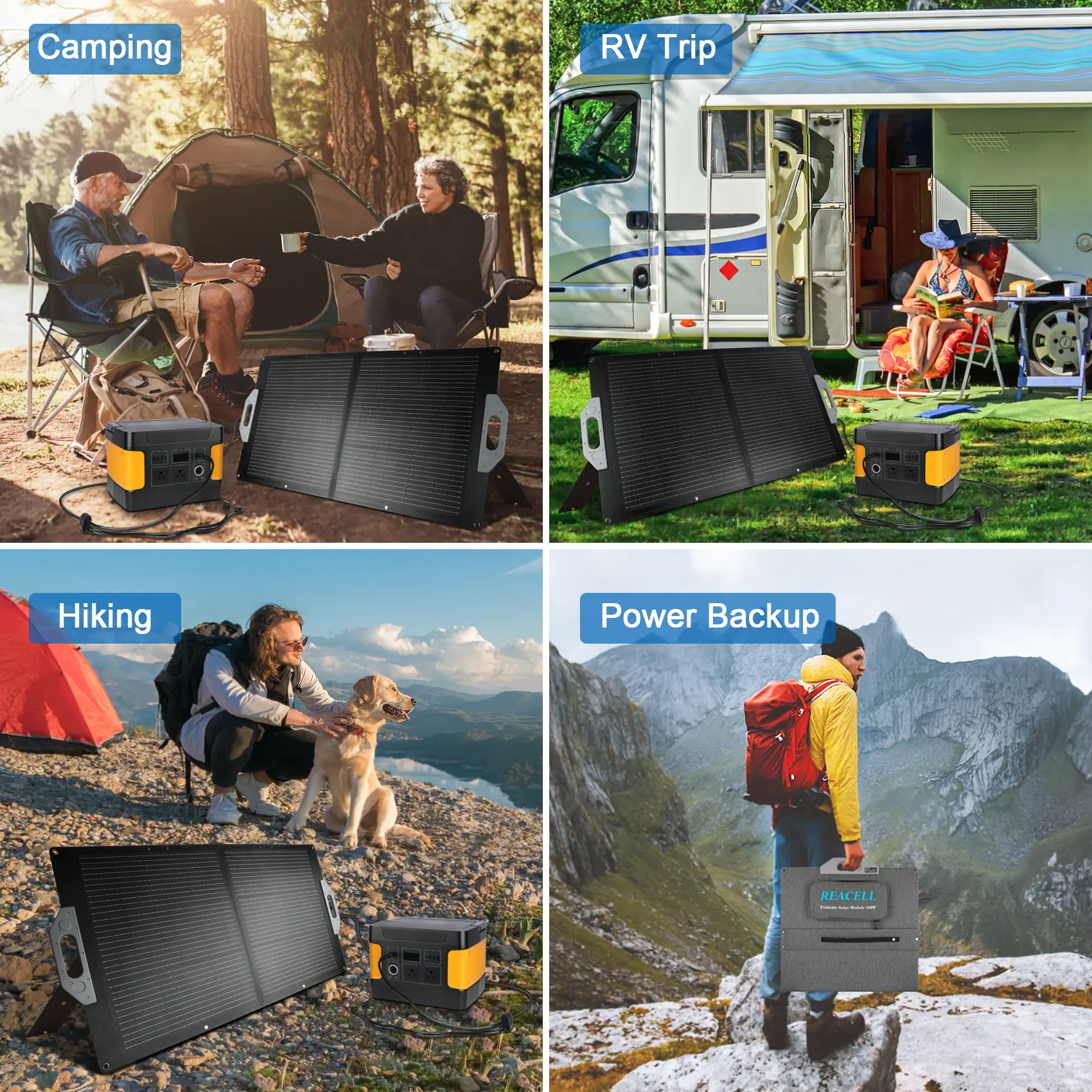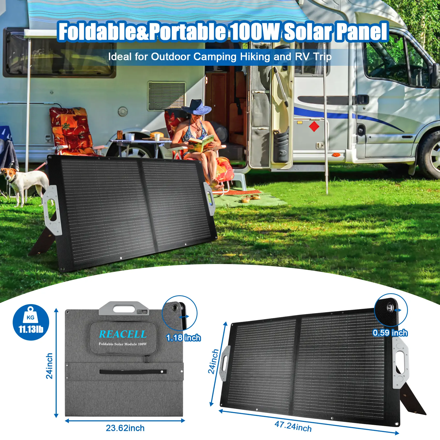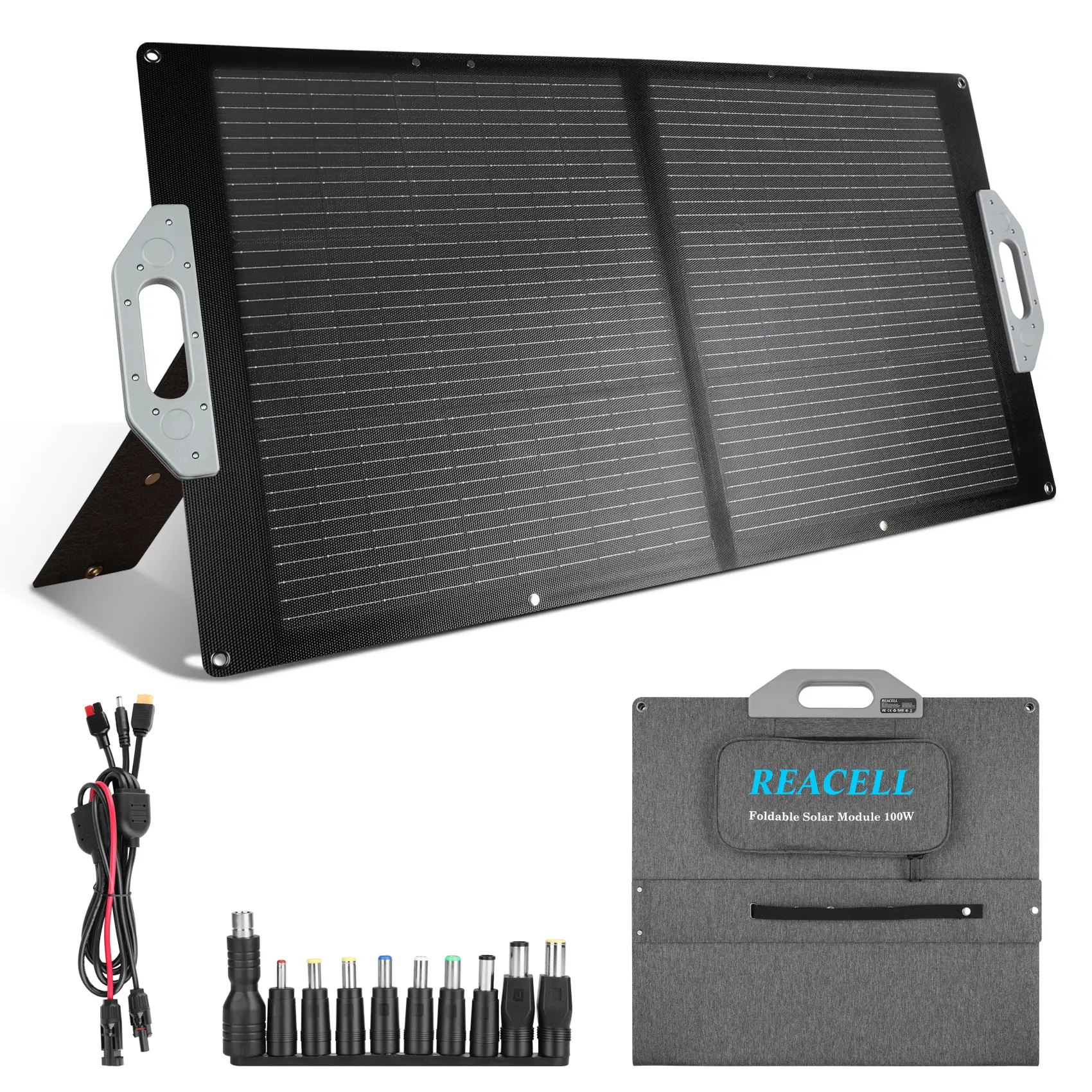 The REACELL 100W solar panel features monocrystalline silicon cells with a 23% photoelectric conversion rate. It delivers enhanced charging efficiency for smartphones and laptops. The panel is IP67 waterproof, ensuring durability for outdoor camping.