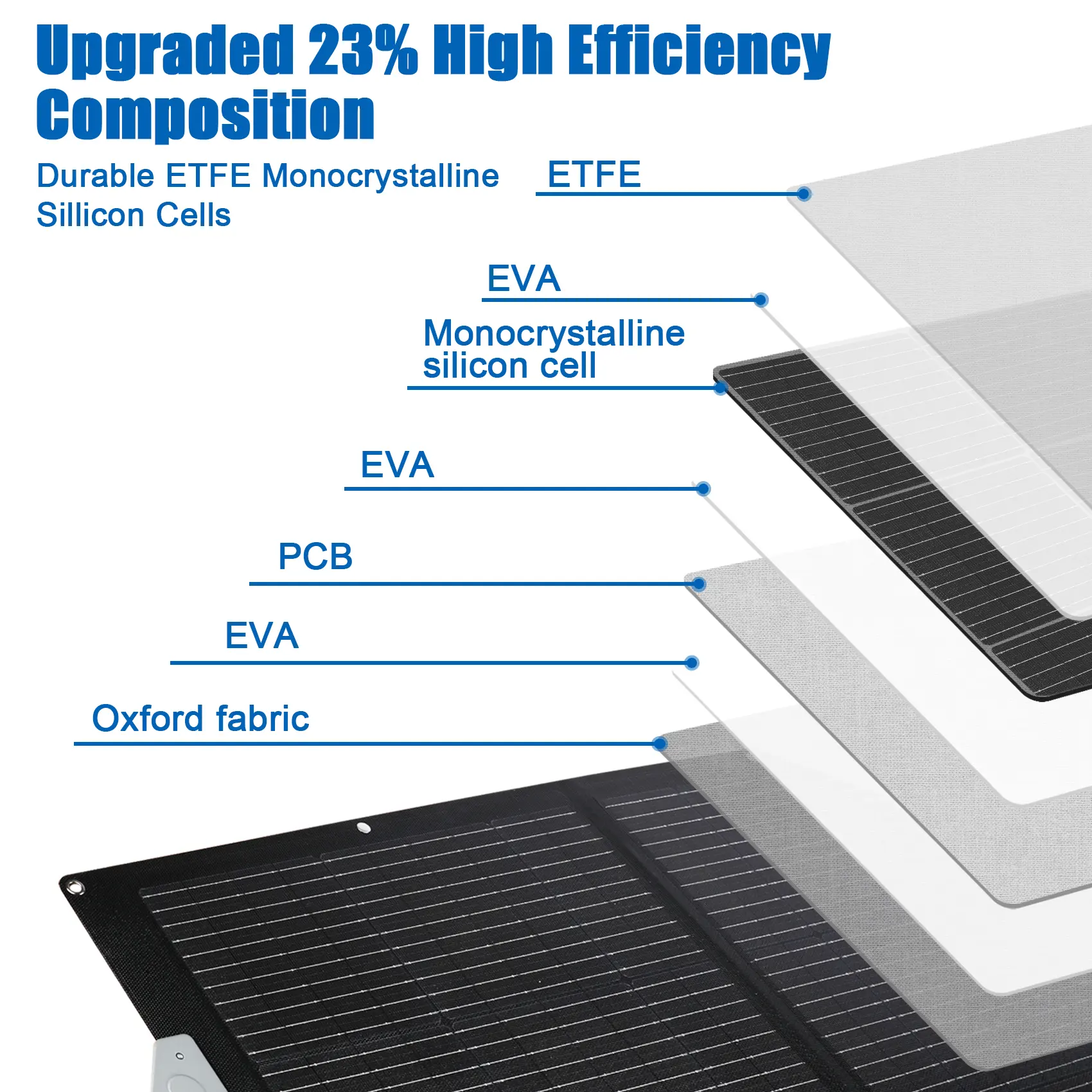 Advanced monocrystalline silicon cells and ETFE structure ensure a 23% conversion rate and fast charging. The panel is portable with a magnetic handle and adjustable kickstand.