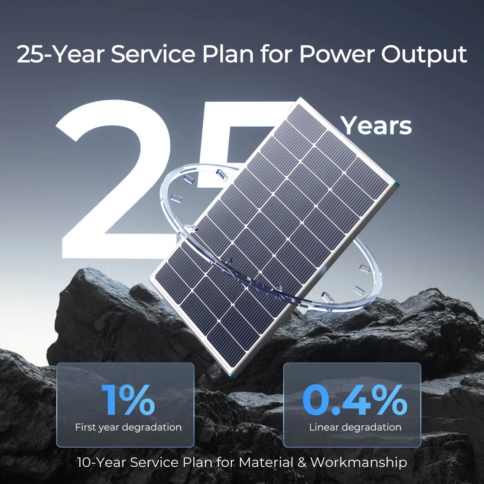 ·【10-Year Warranty】This n-type solar panel comes with a 10-year service plan for materials and workmanship, along with a 25-year commitment to maintain 80% output.