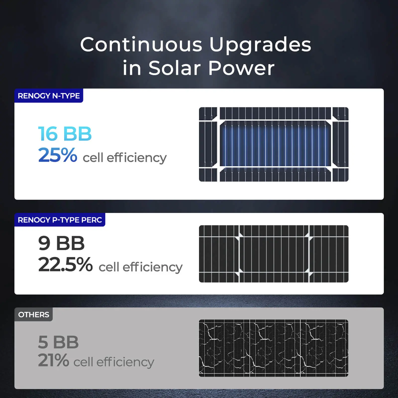 ·【Unmatched Cell Efficiency】Renogy's 100W 12V N-Type Solar Panel features grade A+ cells, delivering an impressive conversion efficiency of 25%. This provides 20W more power output compared to conventional p-PERC panels of the same design.