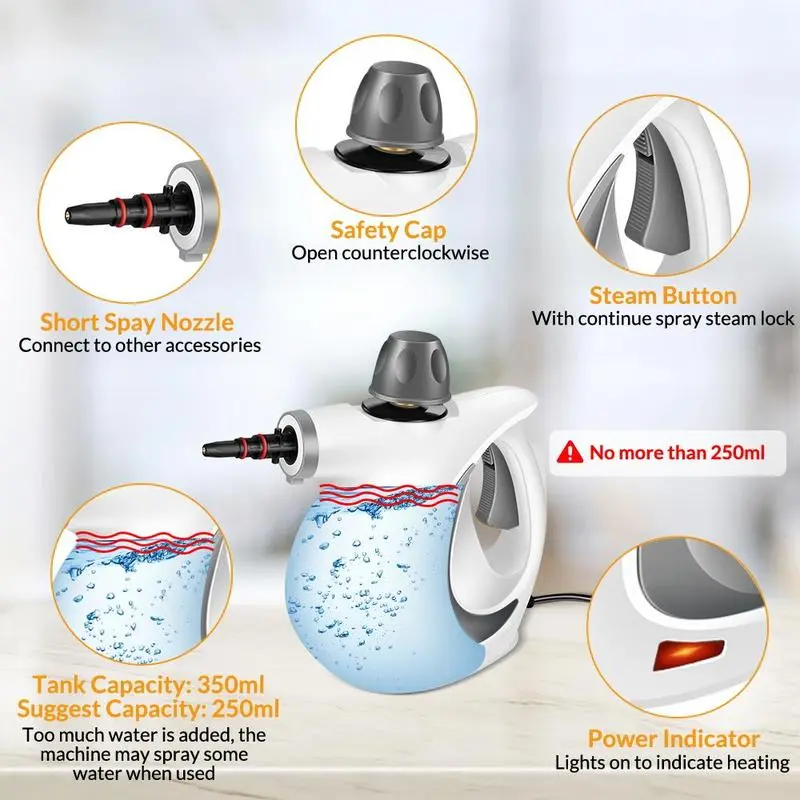 Large Water Tank: 350ml tank (use up to 250ml) for longer cleaning sessions without frequent refills. Ergonomic handle for comfort.
