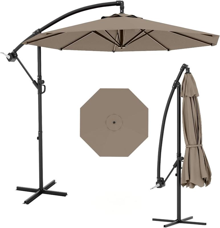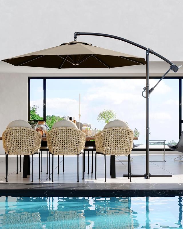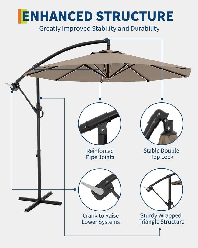 Large Shade Area: Designed for outdoor living, it provides 73.2 sq. ft. of shade when fully opened, perfect for patios, pools, beaches, and market spaces. Durable Frame Structure: Features a rust-resistant metal frame with powder coating and eight ribs for stable support and lasting shade protection. Easy Tilt and Lift System: The user-friendly crank handle allows smooth operation for opening and closing the patio umbrella. Easily adjust the angle to suit your preferences. Premium Canopy Material: Made with high- quality polyester fabric, the cantilever umbrella provides +sun protection and resists fading over time. Please store the offset umbrella indoors during extreme weather conditions for longevity. Vent Design for Stability: The top of beach umbrella includes a vent design that allows air to flow through, reducing wind pressure and enhancing stability. Do not use without umbrella base weights.