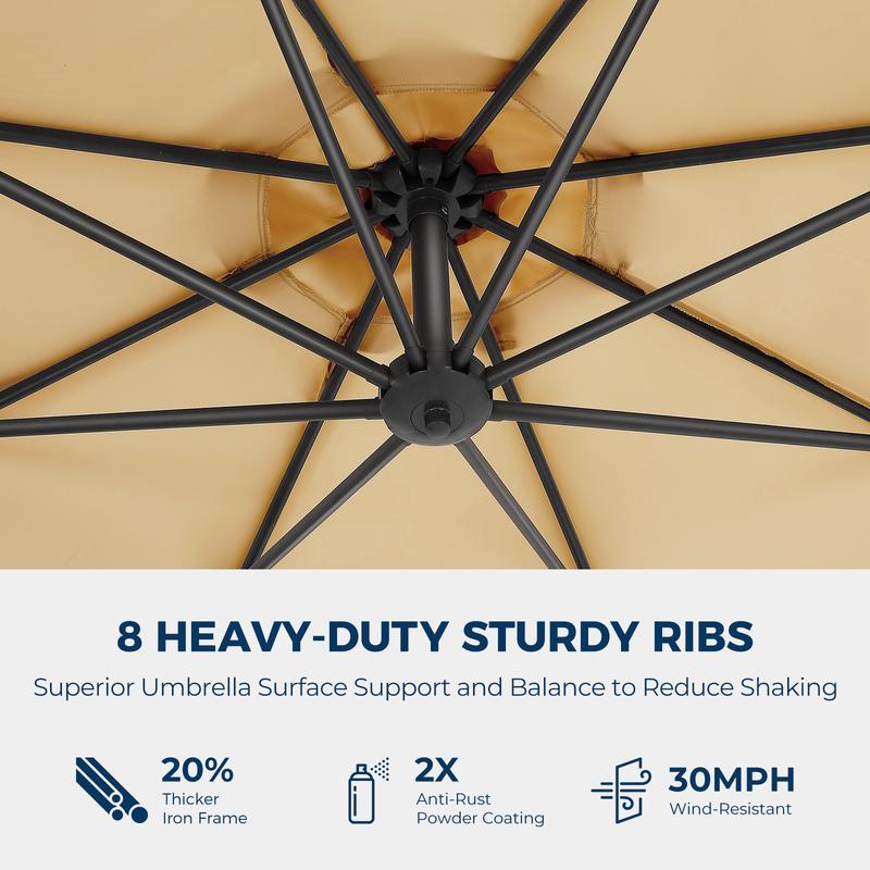 ·【Excellent Windproof Design】:For the purpose of reducing the sway of the canopy,our cantilever patio umbrellas provide the automatic locking mechanism with groove slots at the junction of the pole and canopy.Furthermore,the sliding structure,crank handle,pivots, and knobs are made of robust nylon and fiberglass composite in order to enhance the durability.To enhance wind resistance, we provide a special Velcro design to securely attach the umbrella to the pole.