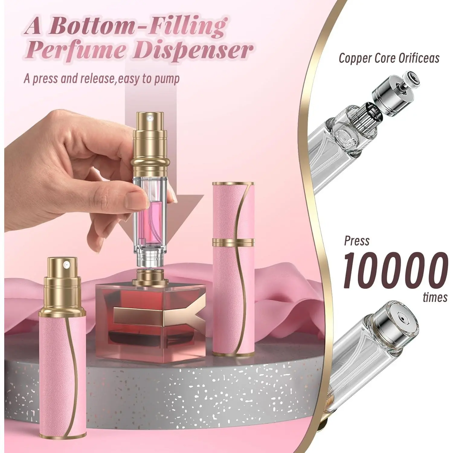 【A Bottom-Filling Perfume Atomizer, Easy to Pump】This perfume refill bottle is designed for ease of use with its bottom-filling feature, use copper core orificea for more than 10 thousand press, allowing you eas to pump your favorite without any mess or . With just a press and release, you can effortlessly transfer liquids. Enjoy the convenience of a refillable design.