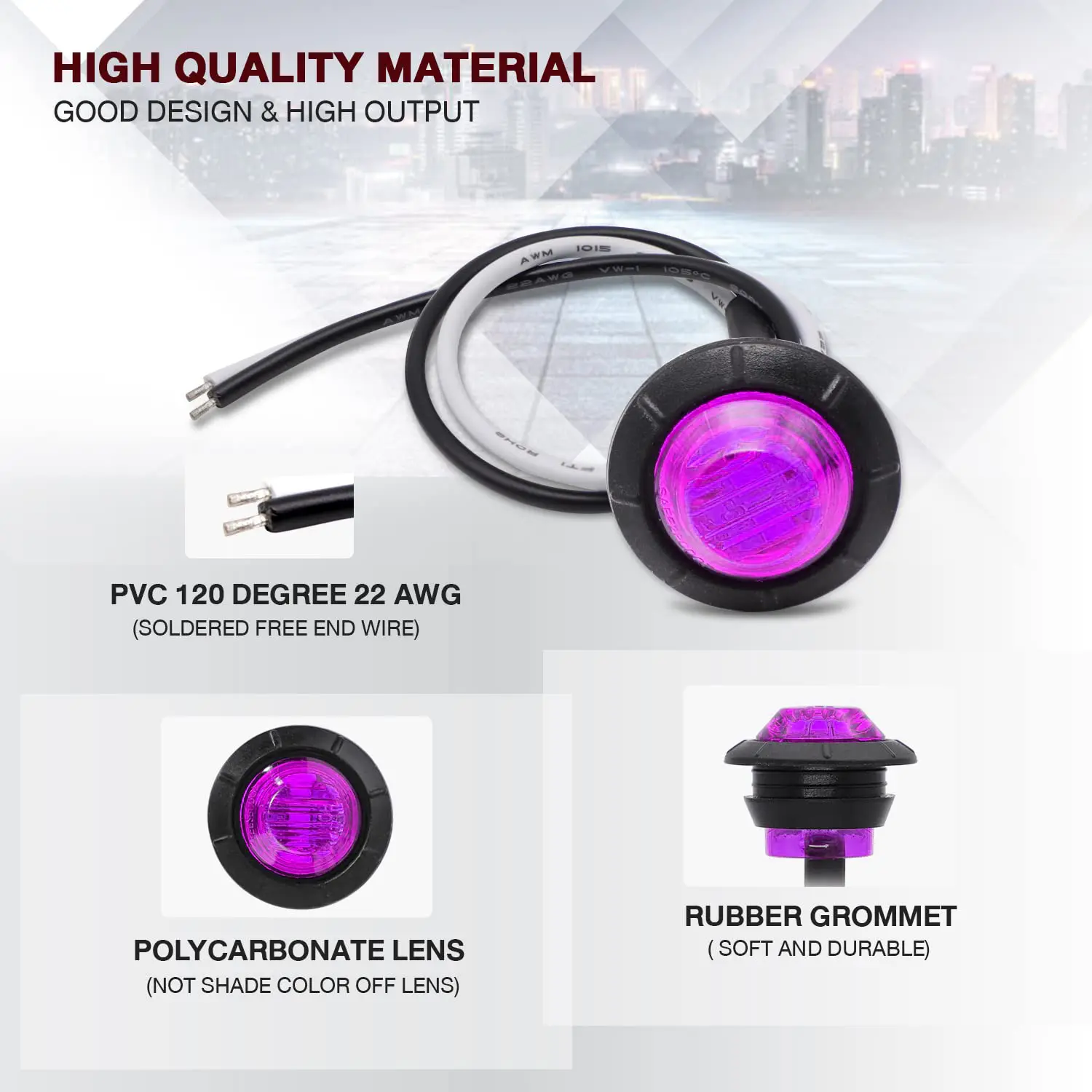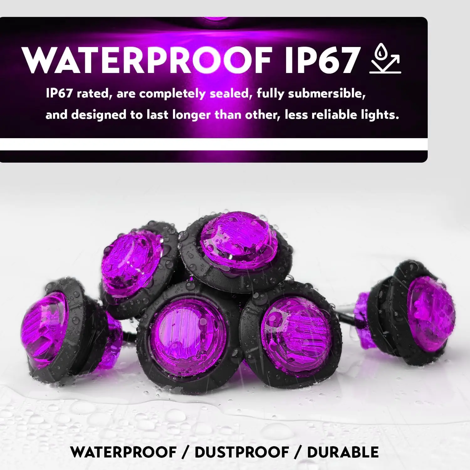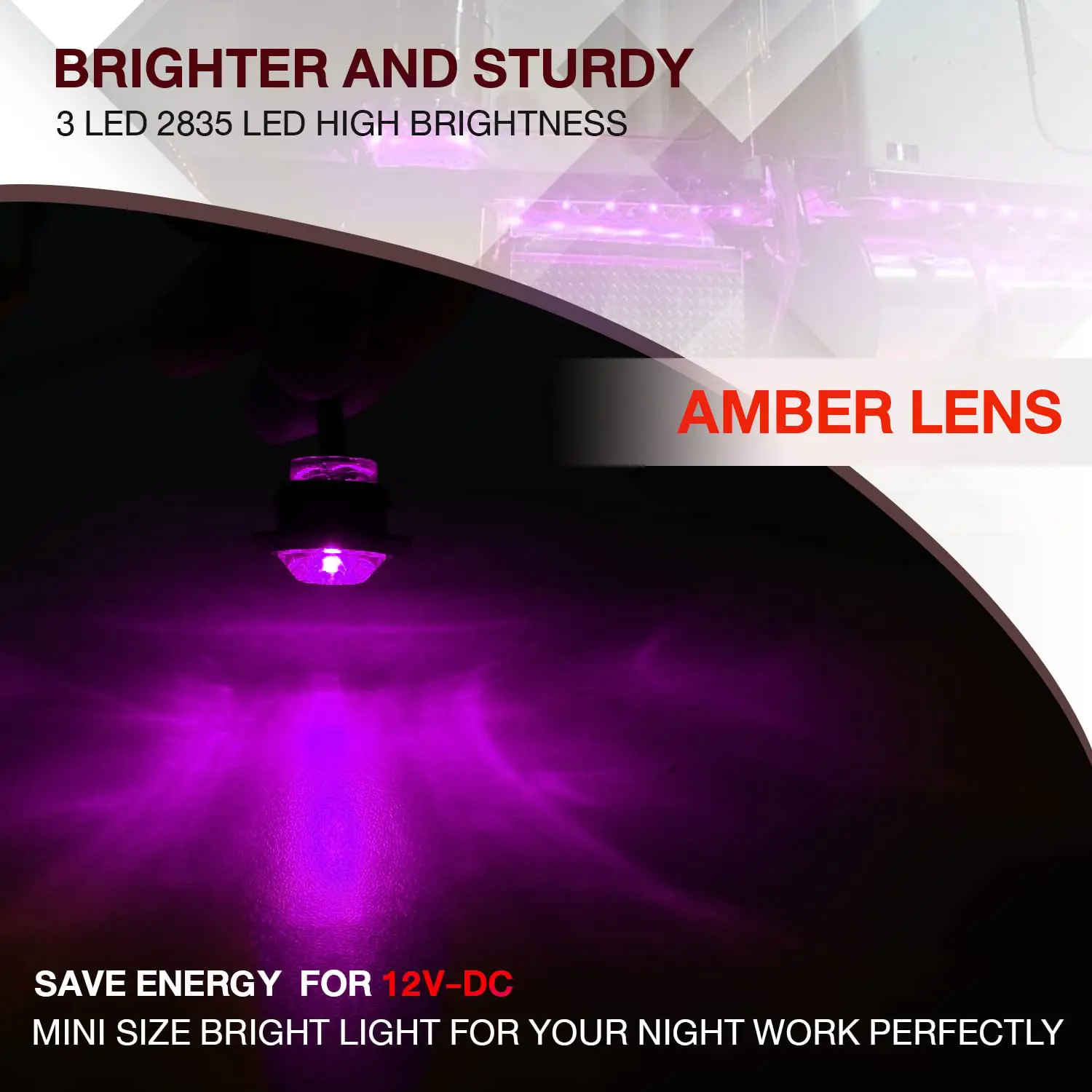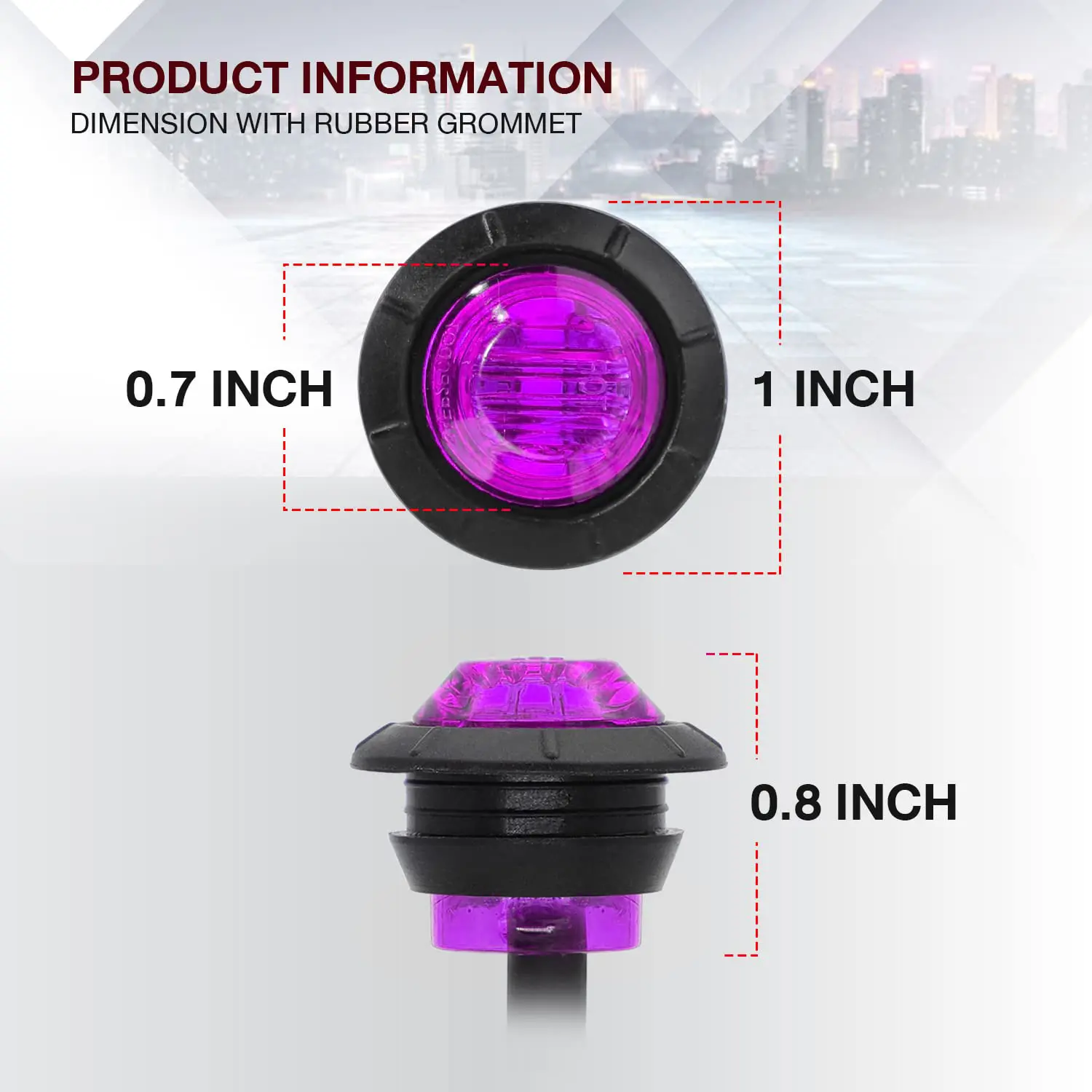 Elevate your vehicle's visibility with these 10 PCS 3/4 Inch Round LED Clearance Lights. Perfect for trucks, RVs, cars, buses, trailers, vans, caravans, and boats, these lights ensure safety during low light conditions. The purple color adds a unique touch to any vehicle. Ideal for both front, rear, and side indicators.
