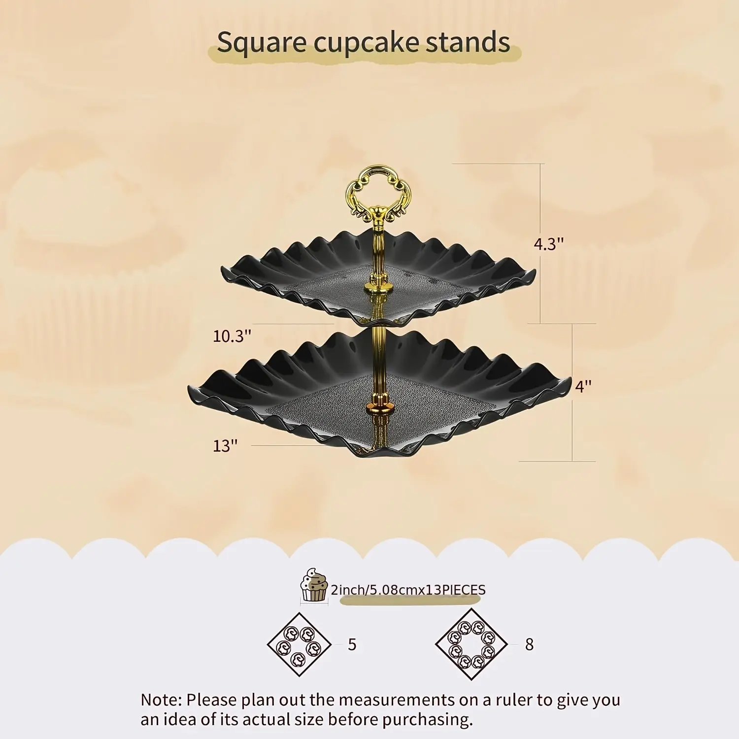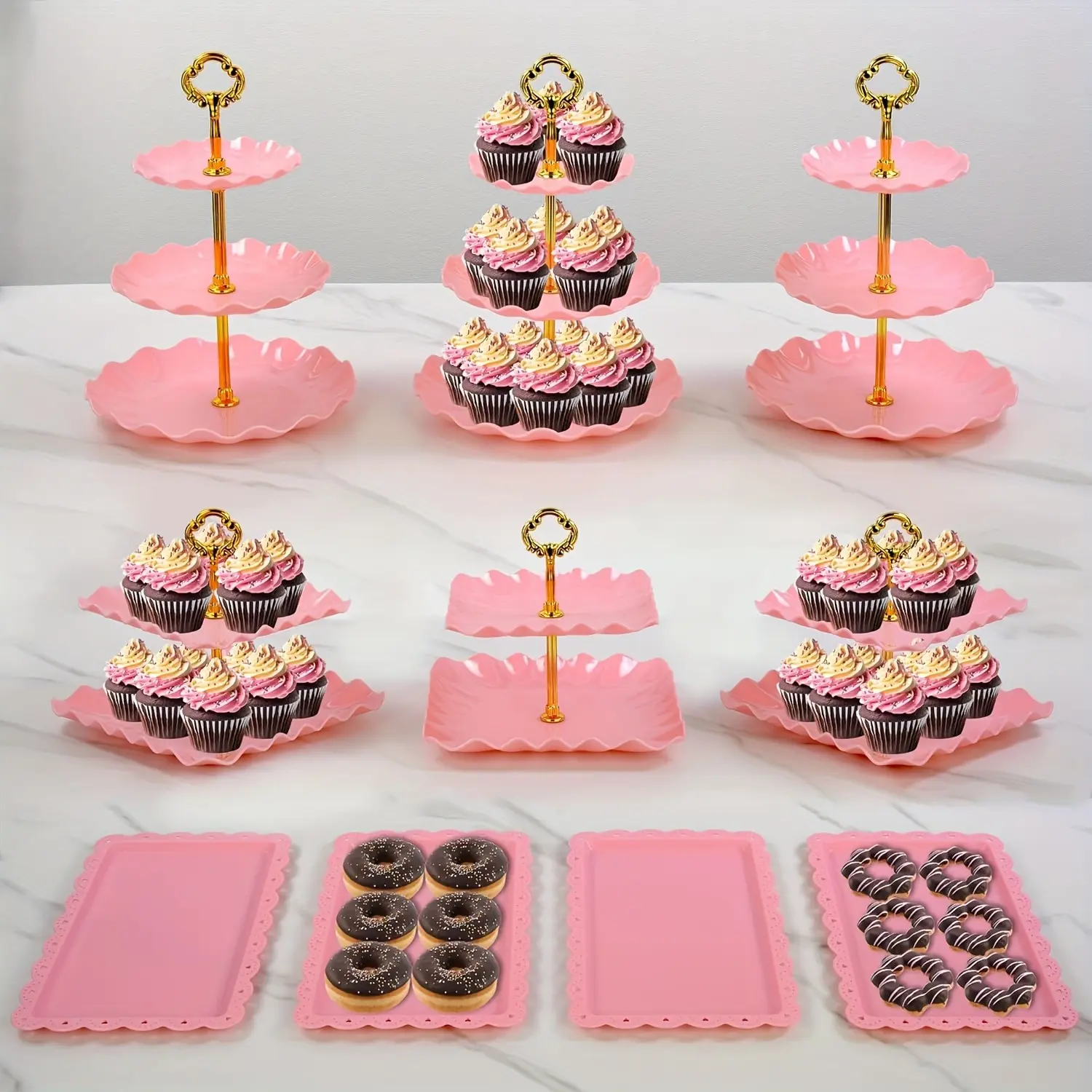 Materials and Design: The main frame is made of white/black/pink plastic with a gold plastic stem/handle. The wavy edges soften the harsh metal texture, creating a beautiful and practical design. The three-tier and two-tier cake stands are connected by uprights and can be stacked freely (total height increases with the number of tiers).