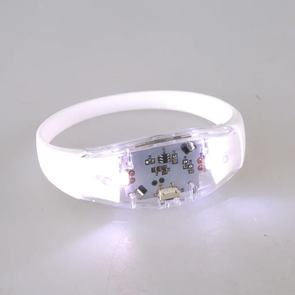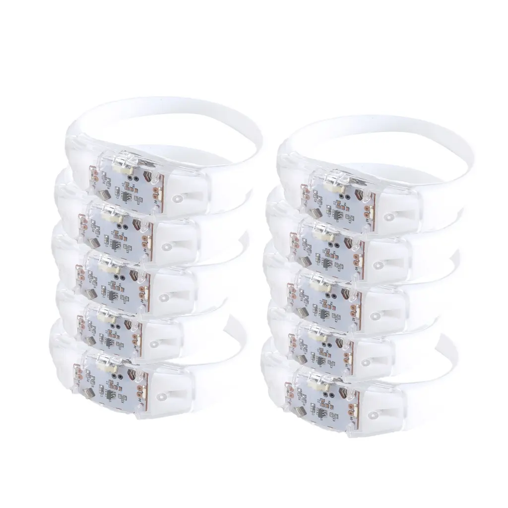 These bracelets come in White color, each crafted from silicone and plastic, designed to fit comfortably while offering multiple flashing mode at the simple press of a button.