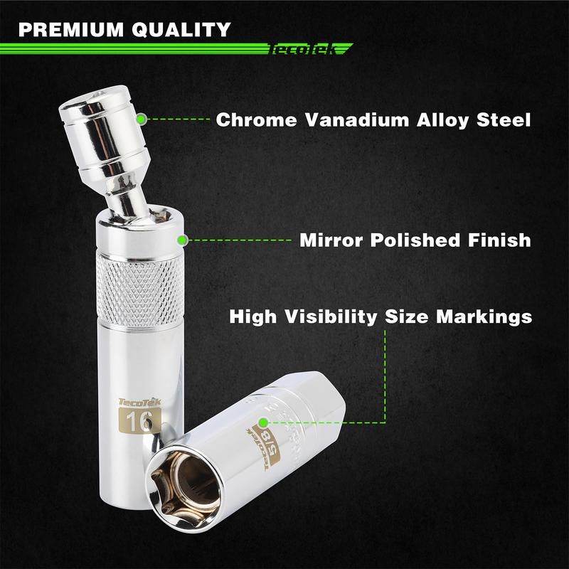 SET INCLUDES】2-Piece 12PT Magnetic Swivel Spark Plug Socket: 14mm, 16mm; 5-Piece 6PT Magnetic Spark Plug Socket: 9/16-inch, 5/8-Inch, 3/4-Inch, 13/16-Inch, 18mm; Spark Plug Gapper; Universal Joint; 10" Long Extension Bar. It's perfect for DIY use.