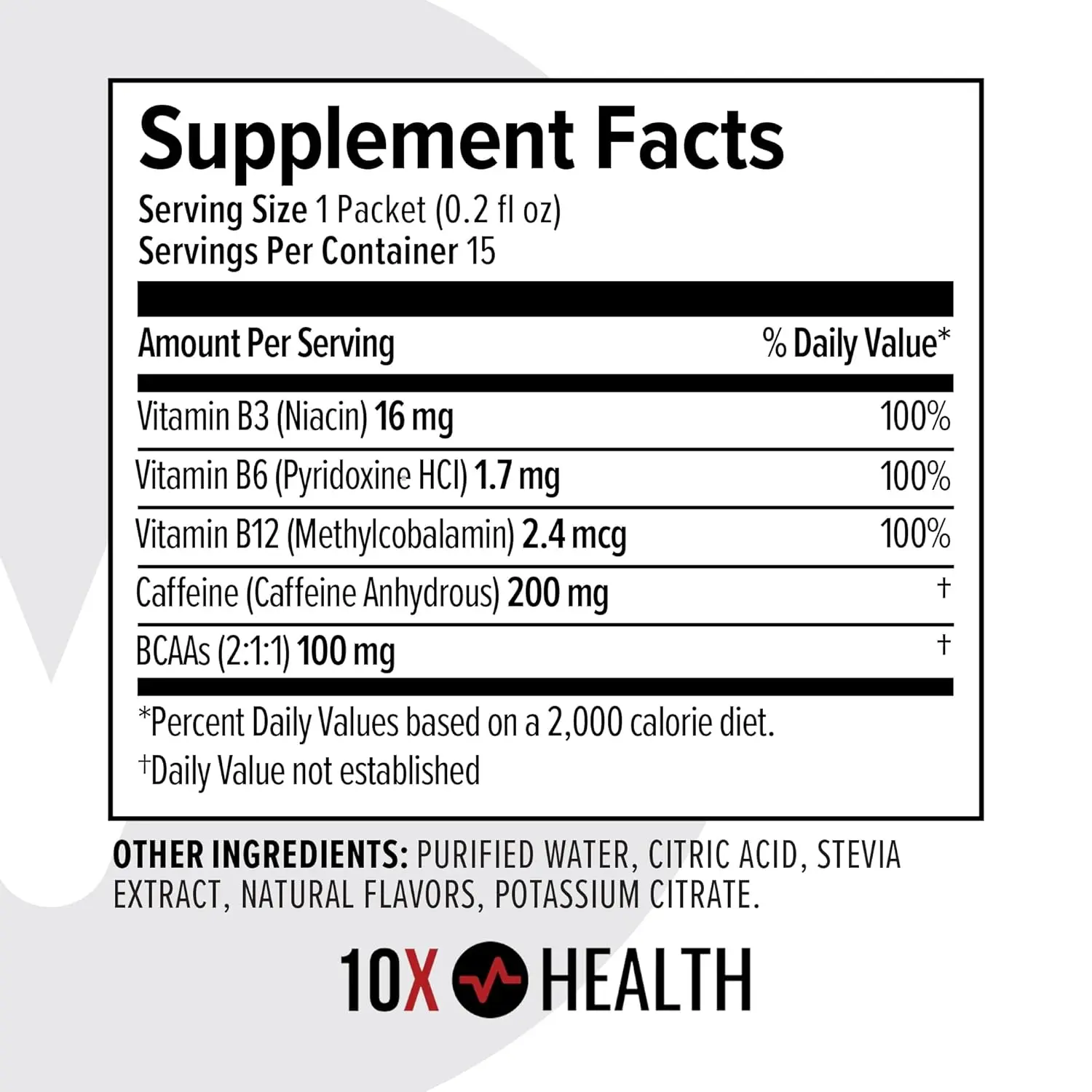 Vitamin B3 (Niacin), Vitamin B6 (Pyridoxine HCl), Vitamin B12 (Methylcobalamin), Caffeine (Caffeine Anhydrous), BCAAs (2:1:1), Purified Water, Citric Acid, Stevia Extract, Natural Flavors, Potassium Citrate