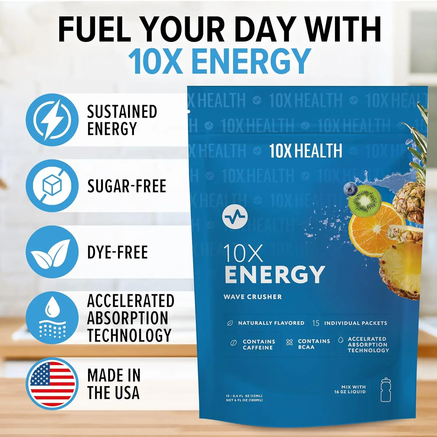 Thanks to Accelerated Absorption Technology, 10X Energy kicks in fast, delivering caffeine, aminos, and vitamins right when you need them.