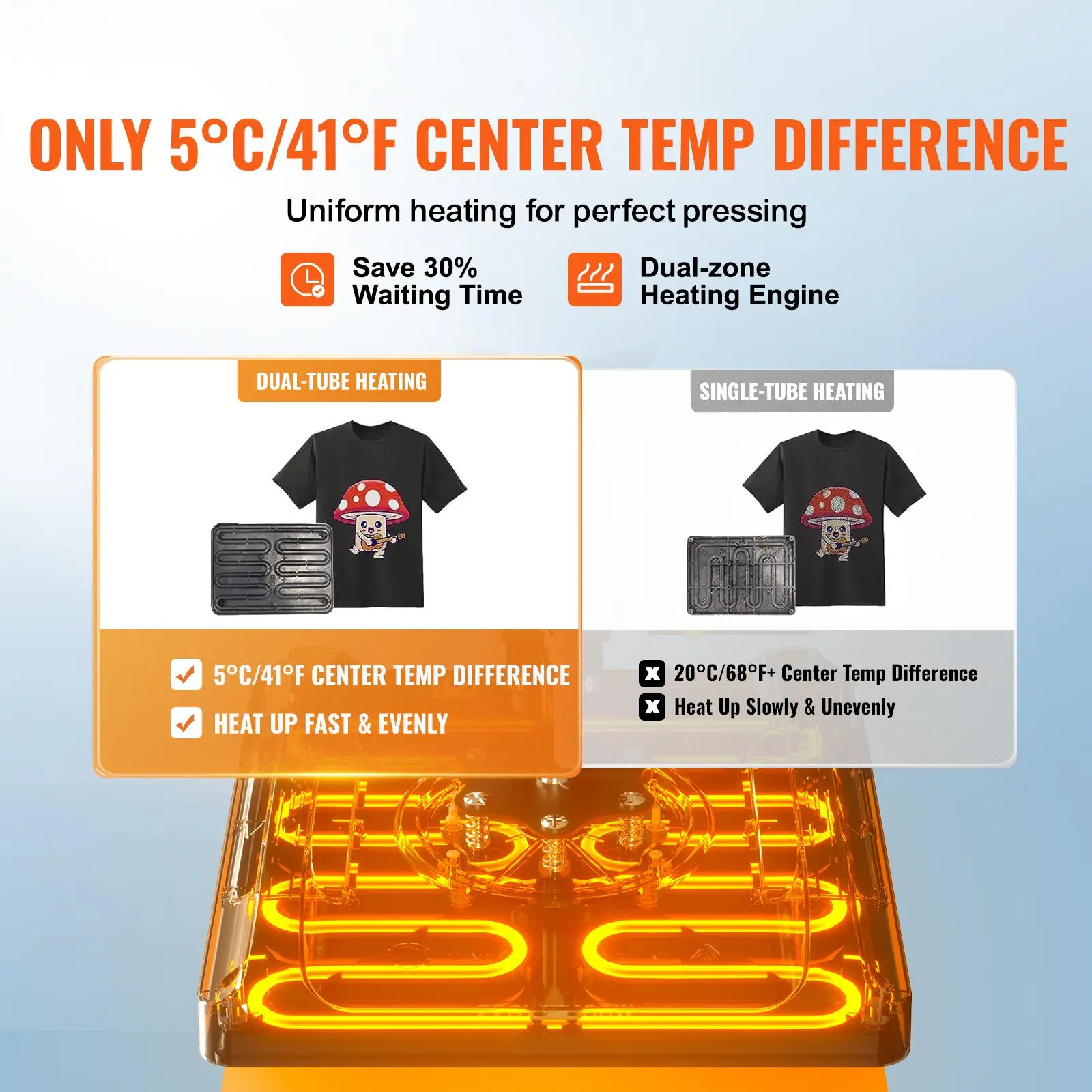 • Dual-Tube Heating: Unlike ordinary single tube heating, our heat press 15 x 12 adopts the latest double-tube heating technology, which makes the temperature difference is only about 5℃ between the center and the edge, making the printing effect better.