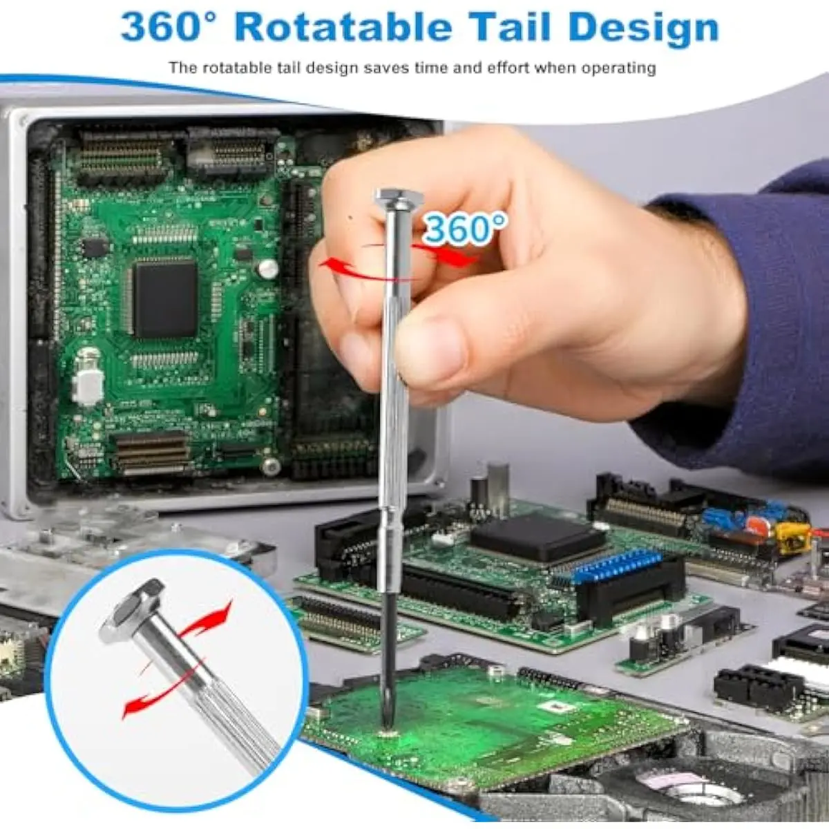 Ergonomic Design: Our small screwdriver set uses nickel-plated handles that are ergonomically designed to provide a comfortable grip and reduce hand fatigue during prolonged use. The bits are made of hardened black oxide shafts, offering exceptional durability and flexibility. The end cap of the mini screwdriver set features a rotating design, making maintenance work easier