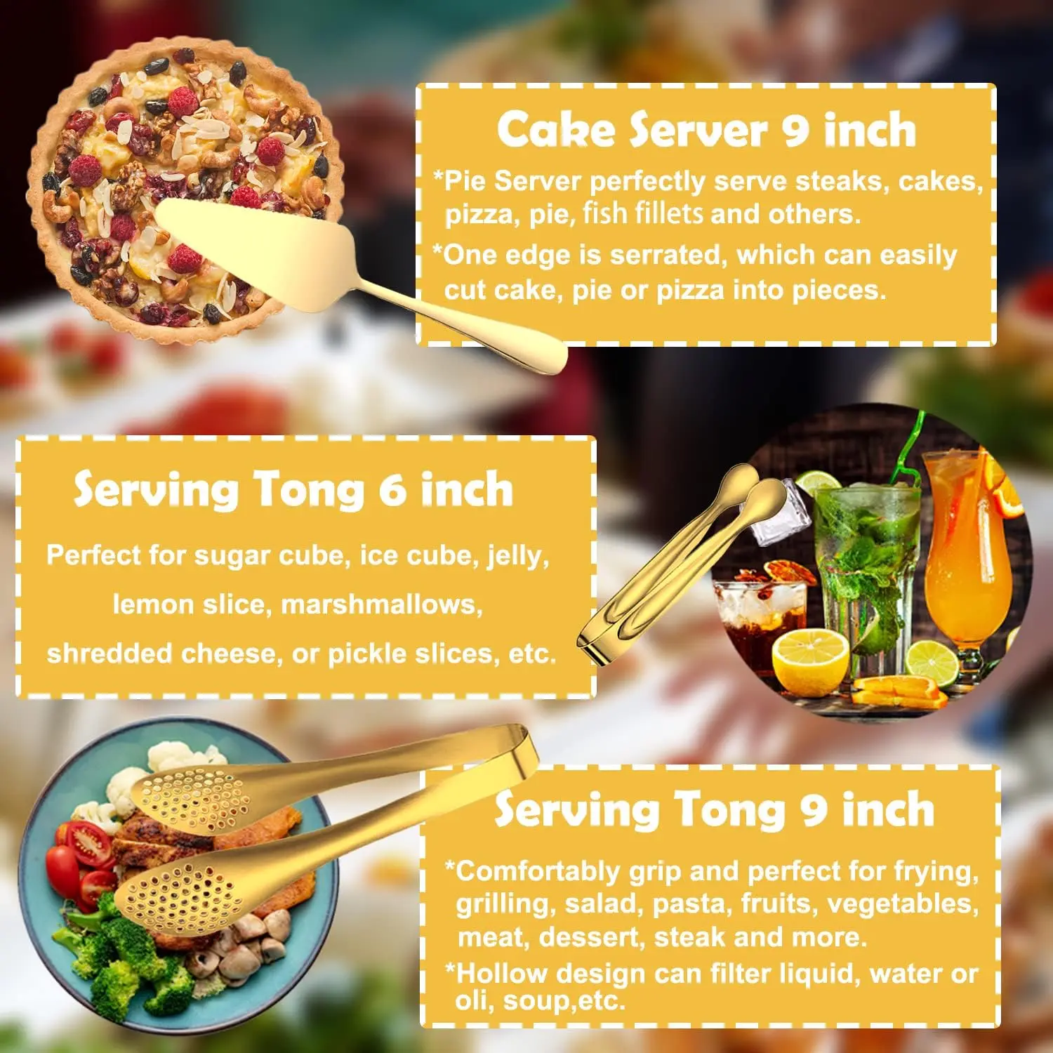 【Multiple Applications】The practical 9 inch tongs are capable of flipping breads burgers or fish, grilling meat or as salad tongs. The other 6 inch small tongs are suitable for serving sugar cube, ice cube, jelly, slice, marshmallows or pickle slices, etc. The slotted spoon and fork can removed the solid in the liquid and the solid spoon without holes are optimal for stirring and serving with a thick sauce. Pie Server perfectly serve steaks, lasagna, cakes, pizza, pie and others.