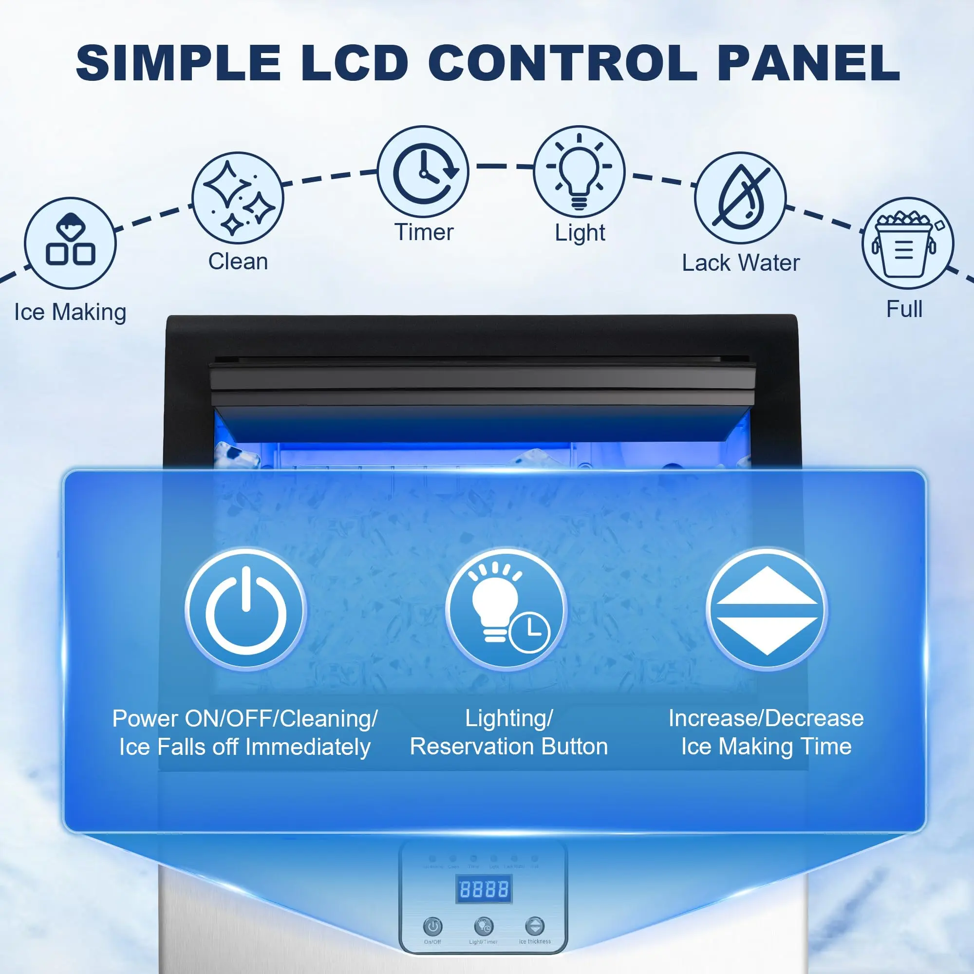 [Easy Installation and Operation] All the functions of the freestanding ice maker machine can be solved with one click through the LCD panel:24H timer, self-cleaning, built-in blue light, malfunction reminders (indicators).Press the (+) or (-) button to adjust the ice making time, thus adjusting the ice size to meet different ice needs.